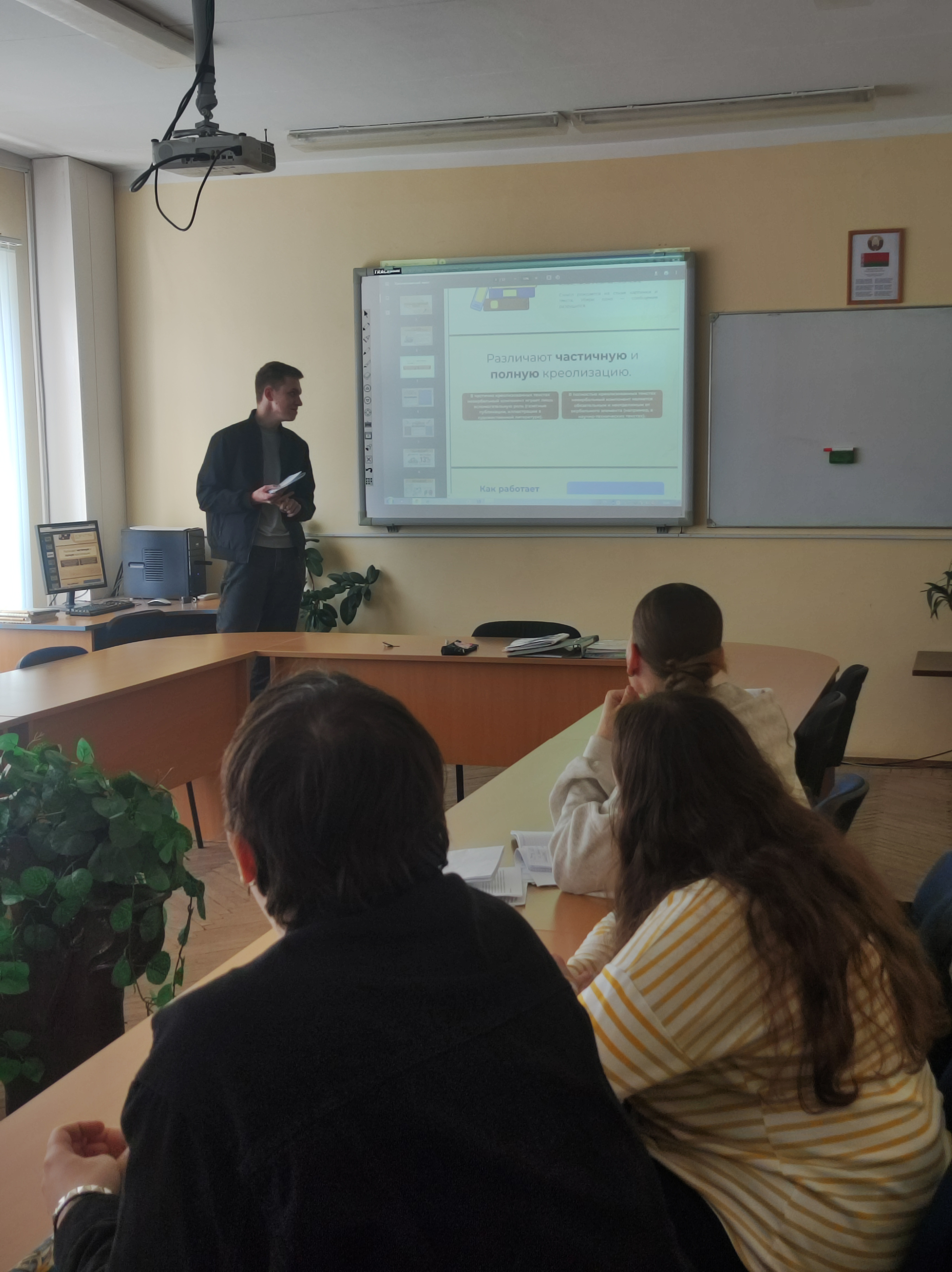 On April 15, 2026, under the guidance of Associate Professor O.V. Sergushkova of the Department of Belarusian and Russian Philology, a research and practical seminar titled “Active Processes in the Russian Language” was held for Group 1 of the fourth-year class. The event took place as part of Youth Science Week. The seminar discussed current trends spanning all levels of the language system—phonetic, lexical, word-formation, and grammatical. O.V. Sergushkova drew the students’ attention to widespread phenomena such as de-terminologization, euphemization, the increasing use of foreign and colloquial vocabulary, slang, abbreviations, and fragmentation, among others. The presentation by Presidential Scholarship recipient Sergey Meshkov, who spoke about creolized text as a phenomenon of modern communication, was particularly useful for the students. All seminar participants were engaged in an interesting and important discussion, which once again reminded us that language is not a static set of rules, but a living, creative process, “an activity of the human spirit.”