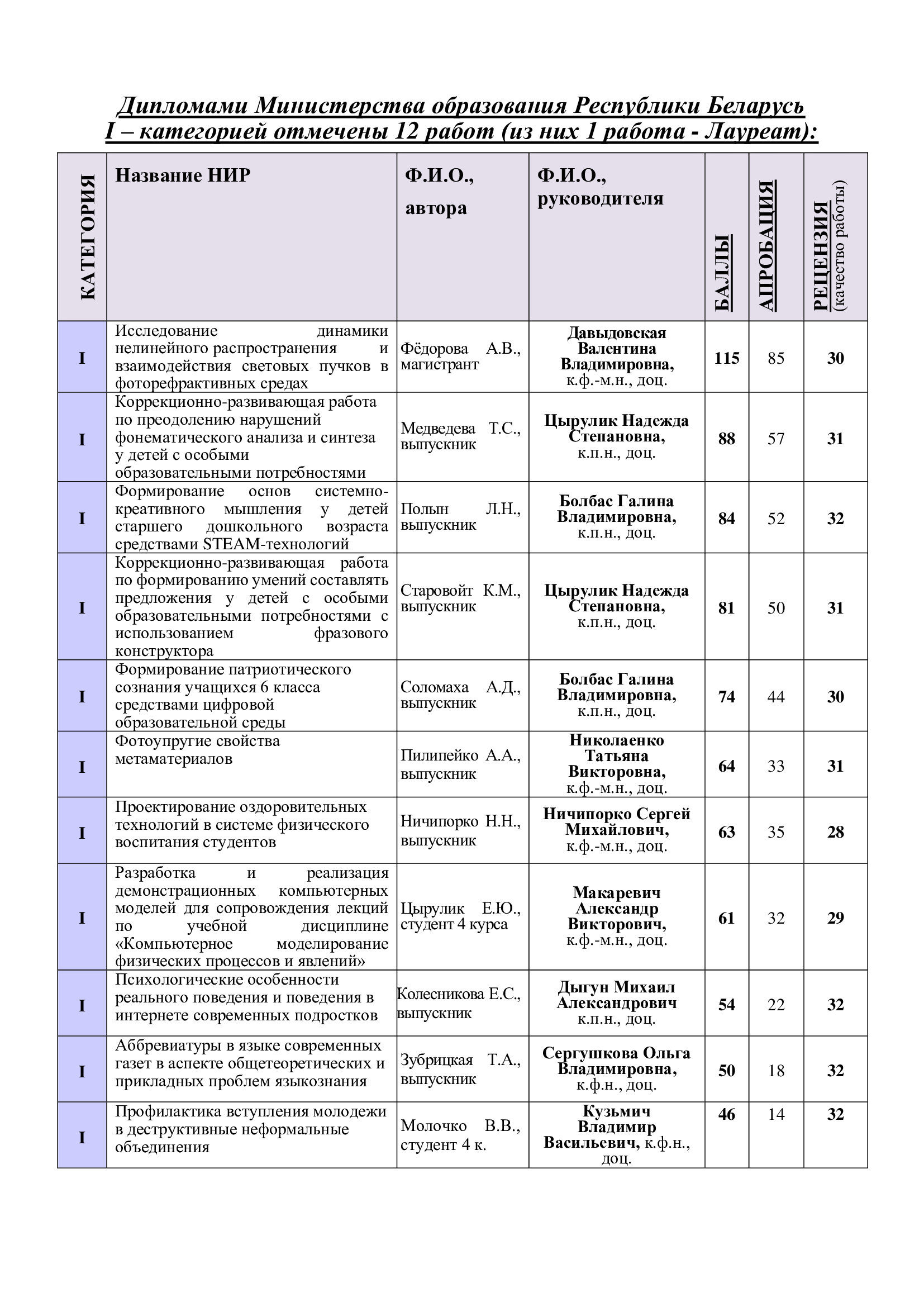 ПРЕДВАРИТЕЛЬНЫЕ ИТОГИ XXXII РЕСПУБЛИКАНСКОГО КОНКУРСА НАУЧНЫХ РАБОТ СТУДЕНТОВ