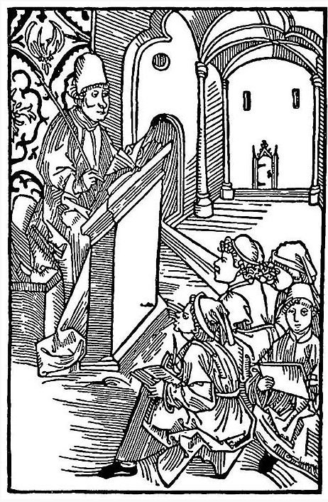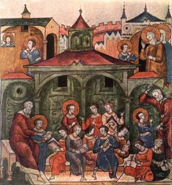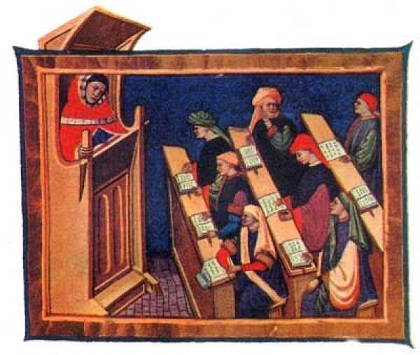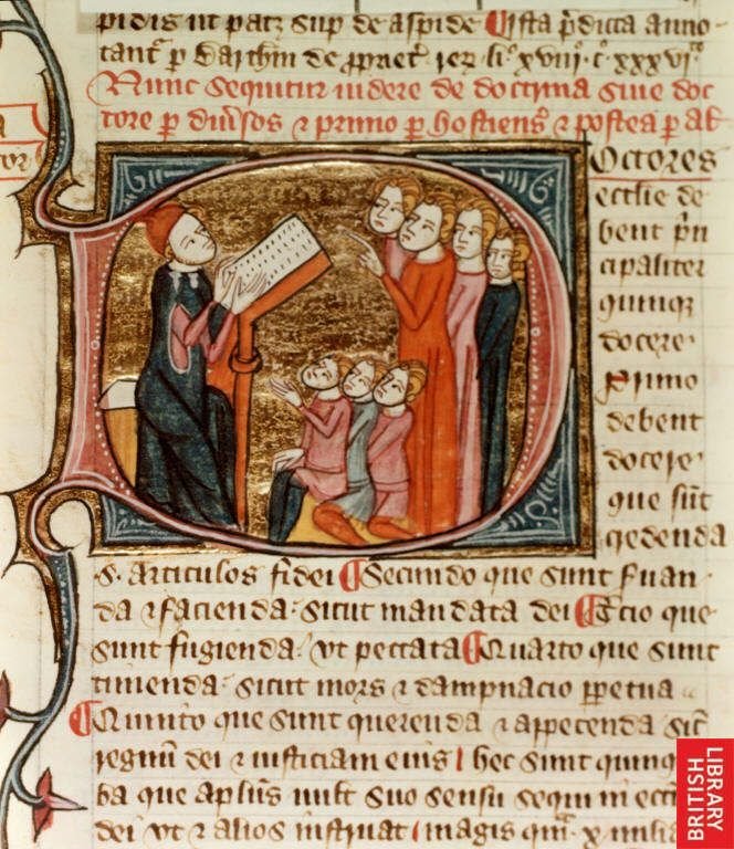 Учитель и ученики. (1360—1375, манускрипт "Всякое благо" ("Omne Bonum") Джеймса ле Палмера, Британская библиотека, Лондон). |