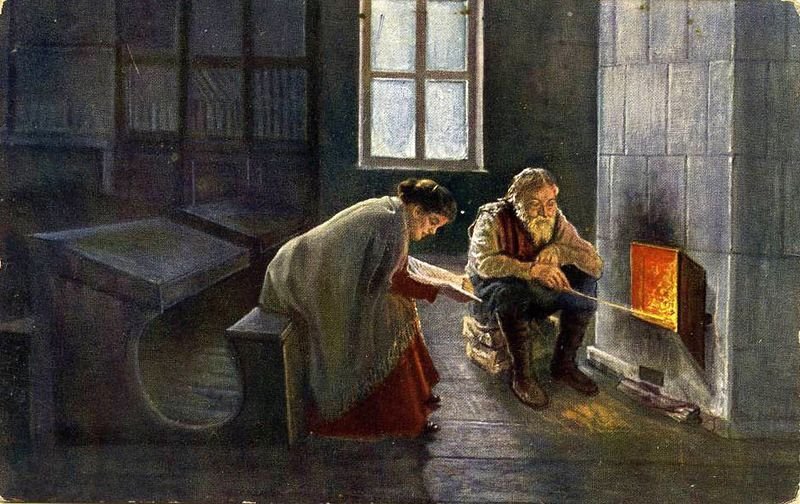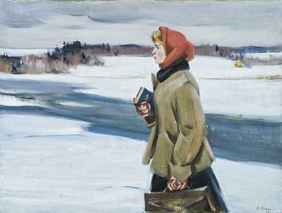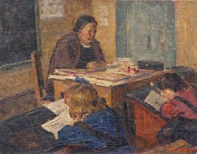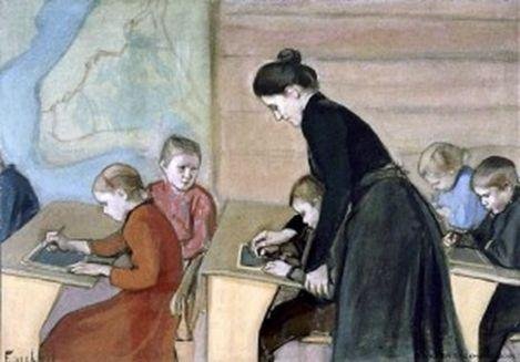 Магнус Энкель (1870—1925) Начальная школа Классная комната, ряд парт. Дети серьезны и сосредоточены. Учительница (темная глухая блуза, темно серая юбка, строгий узел волос) помогает ученику справиться с упражнением. Но, не смотря на всю строгость внешнего вида учительницы и аскетичность интерьера классной комнаты, картина вызывает теплые чувства — лицо учительницы выражает доброту и заботу, уголки ее губ тронуты едва заметной улыбкой |