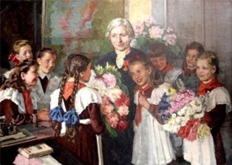 Абрам Моисеевич Харьковский (1911—1995) Награда учителю Пожилая заслуженная (медаль на груди) учительница окружена ученицами (люди старшего поколения еще помнят деление на женские и мужские школы — был такой период в советской педагогической практике). Букеты, улыбки, поздравления, вопросы и… любовь в глазах учительницы, восхищение в детских глазах. |