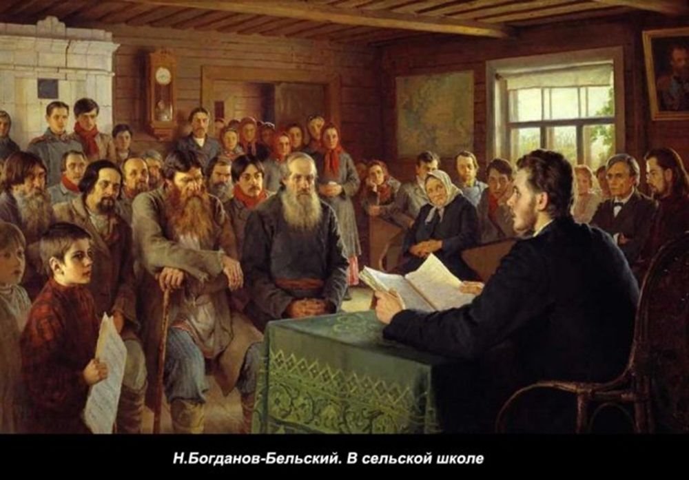 Воскресное чтение в сельской школе. 1895. С. А. Рачинский стал в жизни мальчика человеком, благодаря которому и состоялась судьба Николая Петровича Богданова-Бельского. Сам Николай Петрович часто говорил, что "…на дорогу меня вывел Рачинский. Учитель жизни. Я всем, всем ему обязан". Впоследствии портрет Рачинского будет написан в картине "Воскресное чтение в школе" (1895). |