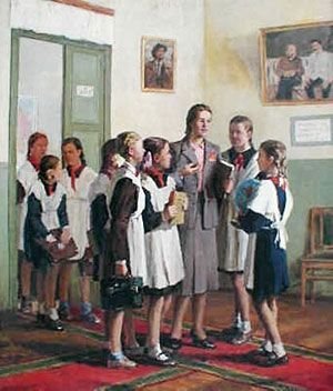 Игорь Александрович Раздрогин (род 1923) Сельская учительница. 1958. Сельская учительница. 1990 Картина в 1960 г. удостоена Ленинской премии. Спустя 30 лет художник вновь посетил эти места, разыскал постаревшую учительницу и написал новый вариант картины: "Сельская учительница — 1990". |