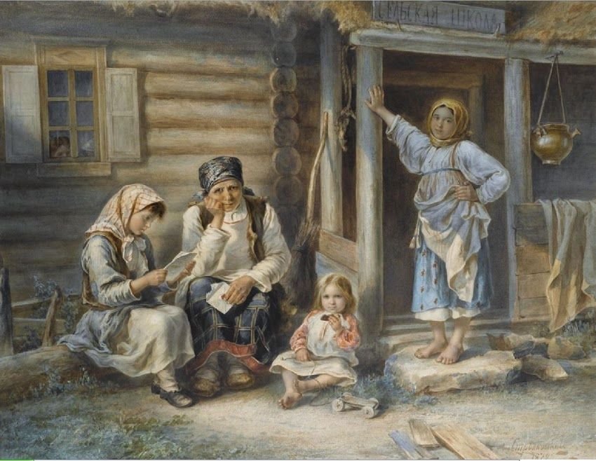 Алексей Иванович Стрелковский (1819—1904) Сельская школа. 1872 Стрелковский также любил писать сцены из крестьянской жизни и часто изображал в своих картинах детей. А сценку из каждодневной крестьянской жизни можно увидеть в картине "Сельская школа". На крыльце деревянной избы стоит, подбоченясь, босоногая девочка. Над ней на деревянной дощечке можно прочитать надпись "Сельская школа". В этой школе учатся деревенские дети, и сейчас у них переменка или уроки уже кончились. К одной из школьниц подошла неграмотная крестьянская женщина с просьбой прочесть письмо. И вот девочка вслух читает его крестьянке. Та слушает, подперев кулаком щёку, и, вероятно, вспоминает своих родных, от которых пришло письмо и которые где-то далеко. А рядом примостилась малышка. В одной руке у неё кусок чёрного хлеба, а в другой – верёвочка с простенькой игрушкой — деревянной тележкой на колёсах. Этой девочке, конечно, ещё рано ходить в школу — её взял с собой кто-то из старших, чтобы не оставлять одну дома. Получается, что художник Стрелковкий сочинил в одной картине целый рассказ, который легко "прочтёт" внимательный зритель. |