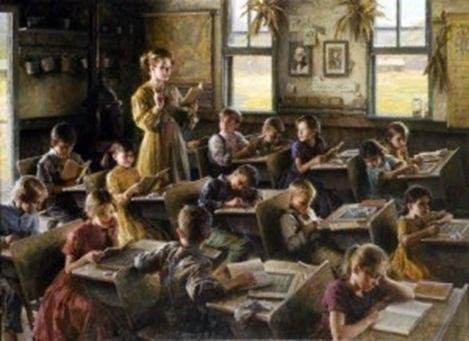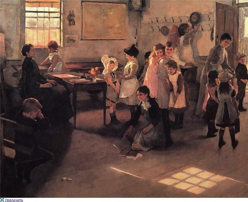 Морган Вестлинг. Сельская школа На картине изображен урок чтения в сельской школе, который проводит молодая учительница. Она полностью увлечена своей работой и вдохновенно читает книгу. Обратите внимание на ее учеников! И вспомните свое детство … Ничто не меняется, и дети во все времена остаются детьми! Кто-то внимательно следит по книге за читаемым, кое-кто не сводит глаз с учительницы (ее лицо, мимика гораздо интереснее книги), а кто-то и отвлечен более "важными" делами: беседой с соседом или неотложными делами. |