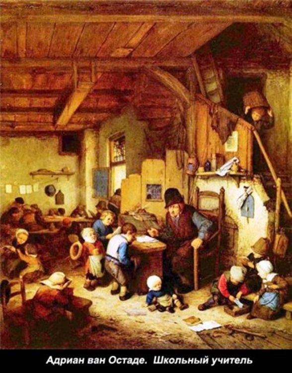 Адриан ван Остаде (1610—1685) Школьный учитель Адриан ван Остаде, нидерландский художник и гравёр, написавший большое количество жанровых картин малого формата, большей частью юмористического содержания, повествующих о жизни горожан и крестьян. Среди таких картин — "Школьный учитель" (1662), отмеченная добродушным юмором и поэтичной созерцательностью. |