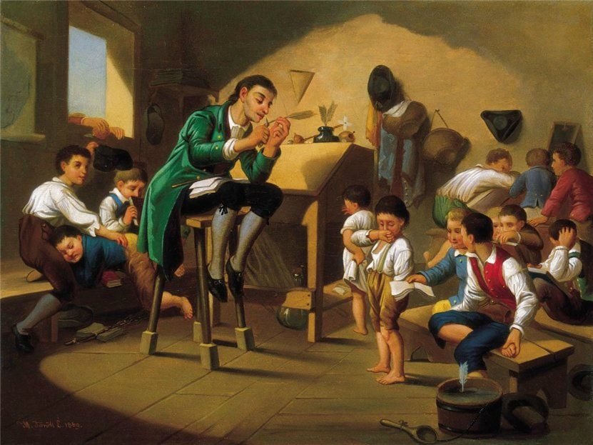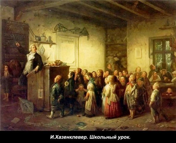 Иоганн Петер Хазенклевер (1810— 1853) Школьный урок Хазенклевер немецкий живописец; писал жанровые сцены, портреты; создал ряд рисунков и акварелей. Большую известность принесла Хазенклеверу серия полотен на сюжеты из "Иобсиады" К. А. Кортума, повествующие о жизни деревенского учителя Иобса (Дюссельдорф, Художественный музей). В духе мастеров голландской живописи очень конкретно переданы интерьеры, мимика всех персонажей. В сценах "Иобс в роли учителя" (1845), "Возвращение студента" (1837), "Иобс — студент" (1840), "Иобс на экзаменах" (1840), "Иобс — ночной сторож" (1850) изображены забавные ситуации. |