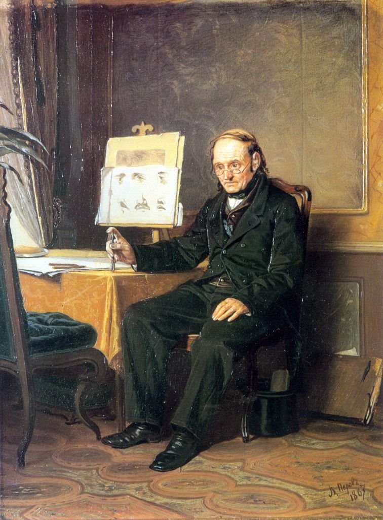 Перов Василий Григорьевич (1833—1882) Учитель рисования. 1867 Картина знакомит нас с участью художника, преданного идеалам прекрасного, но не нашедшего признания. Пожилой, с реденькими волосиками, в потертом, но аккуратном костюме, с потухшим взором, направленным поверх очков в никуда, он сидит, словно пришибленный жизнью, держа в руке рисовальный грифель. Внизу, возле кресла (с какой простотой, несколькими светлыми мазками оно характеризовано!), папка с рисунками, видавший виды цилиндр. За спиной учителя на пюпитре учебные таблицы, предназначенные для копирования: глаз в трех поворотах, губы. В этой крохотной по размерам (25/20см) картине, пожалуй, самое поразительное заключается в высочайшей композиционной ее сложности. И дело здесь не в соотношениях цветовых пятен, гармонии линий и контуров, которыми в последнее время все чаще определяются достоинства живописи, а в наполненности произведения неспокойной мыслью художника, болью его чуткого сердца. Многоплановый рассказ о горестной доле учителя Перов решает самым выразительным, умным и лаконичным образом — через одну фигуру, соподчиняя менее значительное ведущей пластической и смысловой идее. |