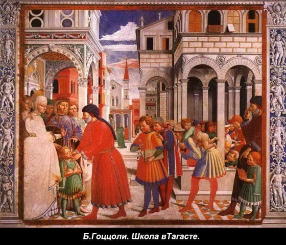 Беноццо Гоццоли (1420—1497) Школа в Тагасте (фреска из жизни Святого Августина) Ребенка отдают в чужие руки, сейчас бы сказали — в частный пансионат. Дома какое воспитание? Мамки, няньки забалуют ребенка, а надо, чтобы человеком вырос. Два школяра постарше с грустью смотрят на новенького, они знают, что его ждет. Справа — помощник учителя держит розгу и готов сейчас же пустить ее в ход. Учителя мы обнаруживаем а нижнем левом углу. Он руками с силой разворачивает к себе лицо маленького Авгуcтина, как бы говоря: "Я твой учитель, гляди на меня, не отводи взгляд, когда со мной разговариваешь!" Очевидно, маленький упрямец не желал смотреть в глаза чужому. Папа и мама делают протестующие движения руками. Они, может быть, никогда не били сына, и никто другой не смел его пальцем тронуть. Но они не возразят вслух. Папа даже сжал губы, хотя ему хочется вымолвить что-то неприятное, прогнать этого небритого недоброго наставника. Но — не прогонит. Надо, чтобы мальчик вырос человеком. И ведь вырос. |