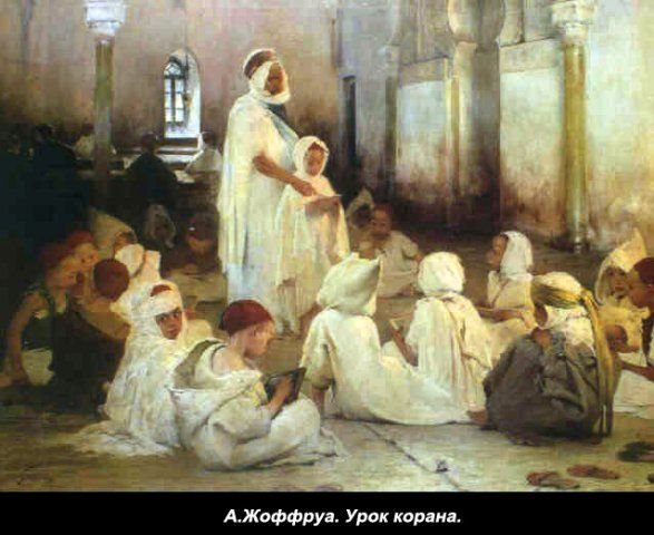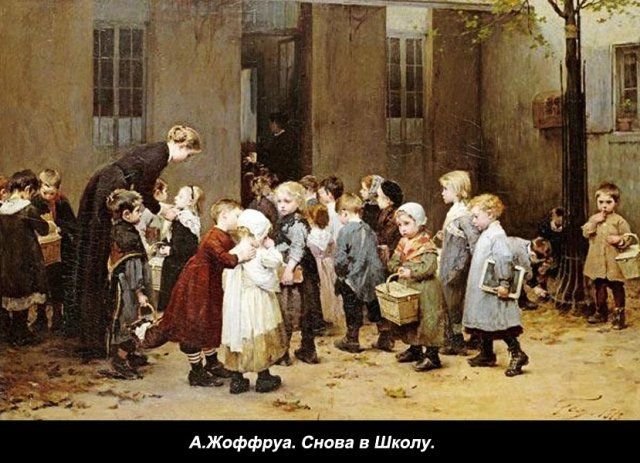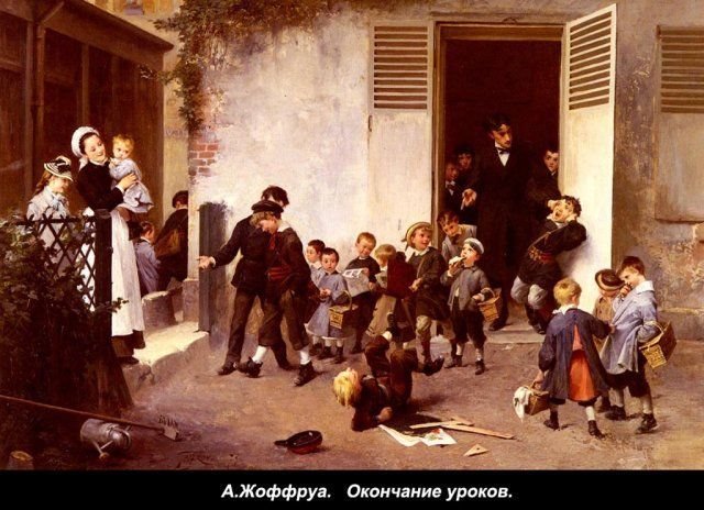 Анри-Жан Жюль-Жоффруа — французский художник, получивший известность благодаря картинам, изображающим жизнь детей в детском саду и школе, наполненную разнообразными событиями. Скромный и трудолюбивый Жюль в начале своей карьеры жил на съёмной квартире с двумя школьными учителями, которые часто служили ему в качестве моделей. Окна его комнаты-студии выходили на школу, и наблюдения за детьми тут же находили своё отражение в картинах. Урок Корана. Детский класс. Окончание уроков. Снова в школу |