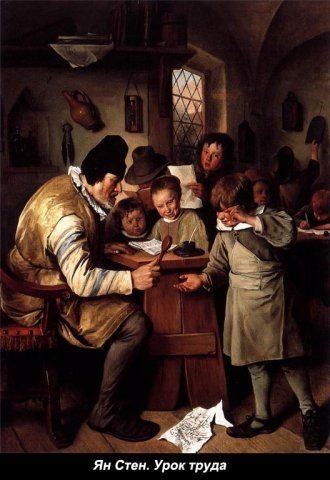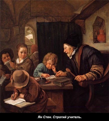Ян Стен (1626—1679) Урок труда. Строгий учитель Стен Ян — знаменитый голландский художник, самый жизнерадостный и остроумный живописец 17 столетия, известный художник-жанрист, названный так благодаря юмористическим бытовым сценам в своих картинах, наполненных теплой сердечностью, беззлобной иронией, в которых жизнь представлена как обширная комедия нравов. |