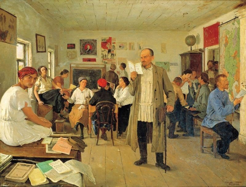 Михаил Васильевич Нестеров (1862—1942) Экзамен в сельской школе. 1884 Художник замечательно изобразил эмоциональное состояние экзаменуемого ребенка — это смущение, волнение, непонимание чего от него хотят (возможно, не научив), даже страх перед этой комиссией, в которой есть его учитель, по виду — приходящий священнослужитель и некий, говоря современным языком, представитель деревенской общественности, возможно, попечитель данной школы. Критики относят эту картину молодого художника к остро-обличительным. По историческим документам известно, что родители не были обязаны посылать детей в школу, и дети не одновременно приступали к учёбе и так же не одновременно оставляли учёбу, так что большинство детей училось около пяти месяцев в году. Земскую школу иногда иронически называли "трёхзимней". Основной причиной короткого учебного года называлась занятость крестьянских детей, даже самых маленьких, в домашнем хозяйстве — родители могли себе позволить отпустить их в школу только в зимнее время года, когда не было сельскохозяйственных работ |