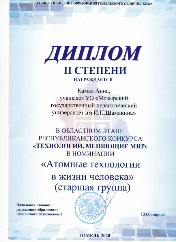 По итогам конкурса студентка 2 курса технолого-биологического факультета Камко Анна награждена дипломом II степени в номинации «Атомные технологии в жизни человека». На конкурс была представлена работа под названием «Человек и ядерная энергетика». Руководитель – Дорофеева О.С., старший преподаватель кафедры технологического образования.