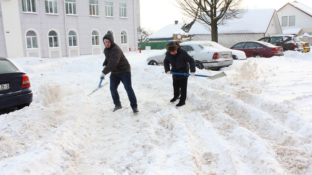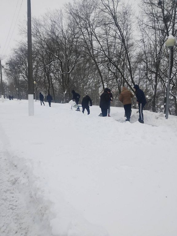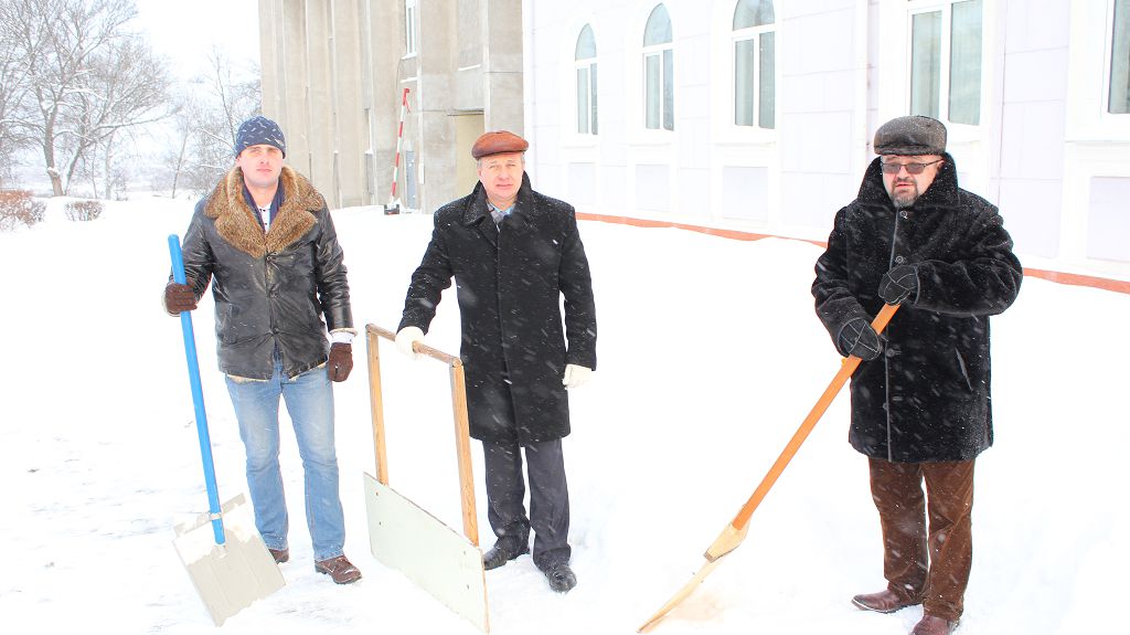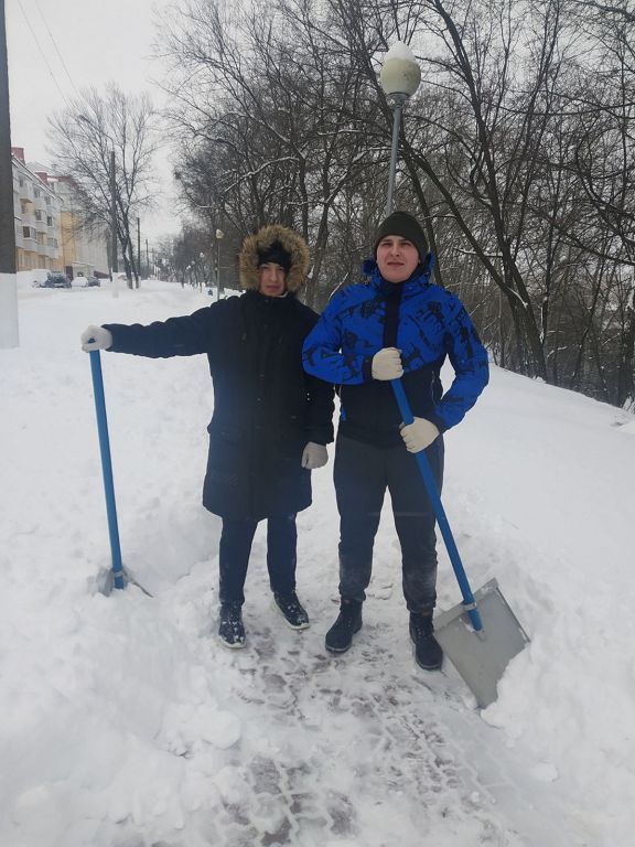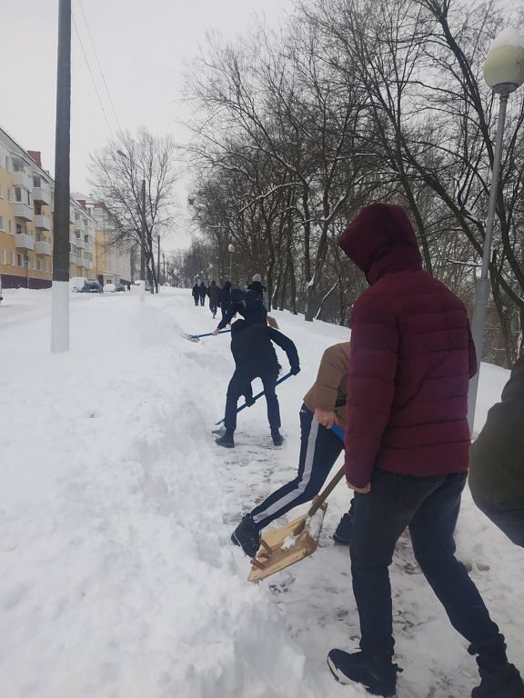 Студенты расчищали дорожки около Мозырского роддома, а сотрудники университета трудились над расчисткой снега на территории университета.
