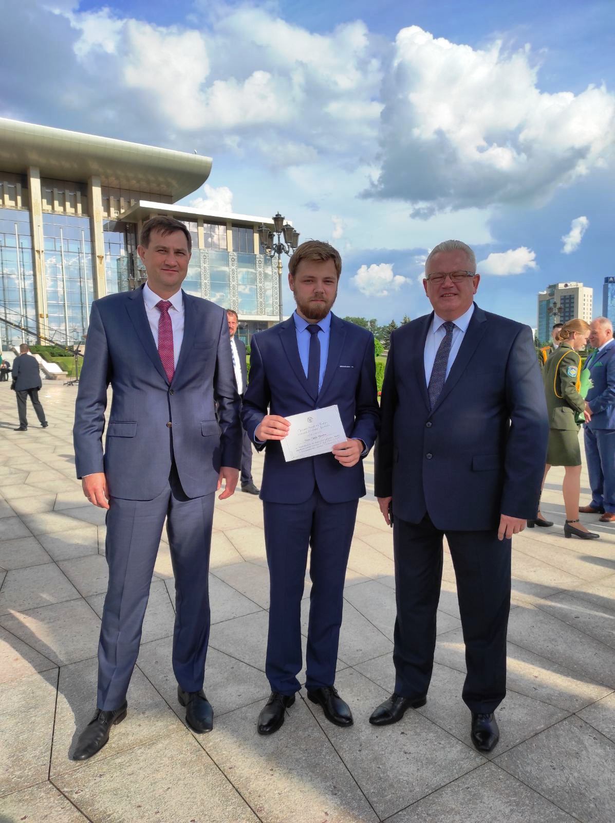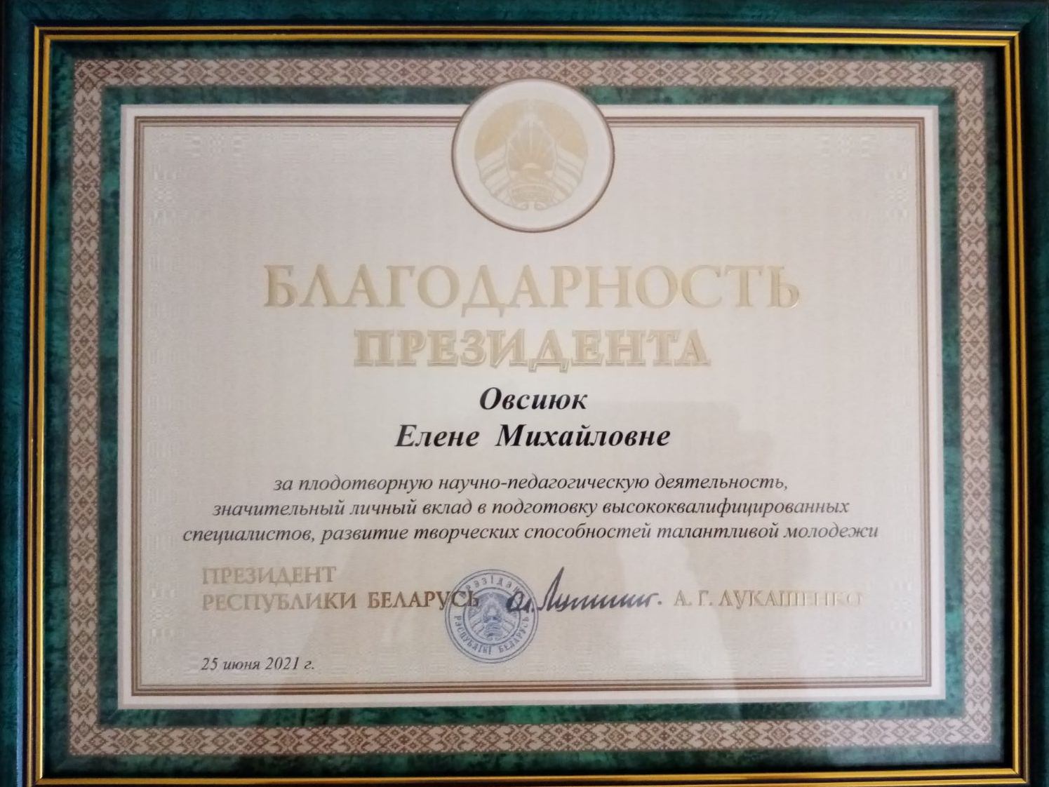 На Республиканском балу выпускников высших учебных заведений Александр Лукашенко также вручил государственные награды преподавателям и руководителям белорусских высших учебных заведений. Благодарность Президента Беларуси за плодотворную научно-педагогическую деятельность, значительный вклад в подготовку высококвалифицированных специалистов, развитие творческих способностей талантливой молодежи была объявлена Овсиюк Елене Михайловне, заведующему кафедрой теоретической физики и прикладной информатики.