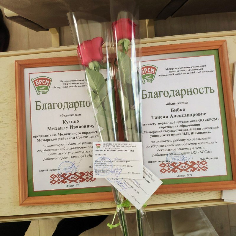 Благодарности Мозырской РО ОО «БРСМ» за активную работу по реализации государственной молодежной политики и деятельное участие в жизни районной организации ОО «БРСМ» были вручены: