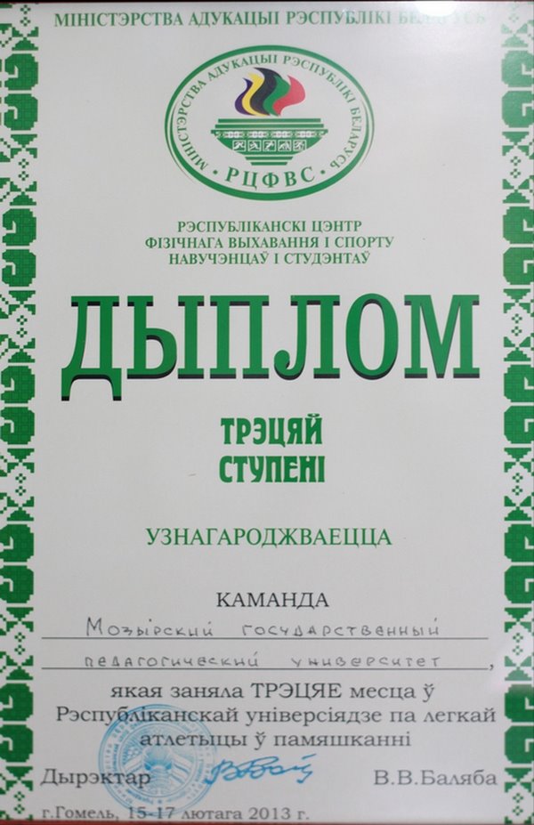 На завершившейся Республиканской универсиаде по легкой атлетике в закрытых помещениях, которая проводилась в период с 15.02.2013г. по 17.02.2013г. в г. Гомеле и в которой приняли участие 27 команд из высших учебных заведений нашей страны, сборная команда УО «Мозырский государственный педагогический университет имени И.П. Шамякина», представленная 14 студентами (5 – мастеров спорта, 9 – кандидатов в мастера спорта), выступила достойно и заняла 3 место, уступив только Гомельскому государственному университету имени Ф. Скорины и Витебскому государственному технологическому университету.