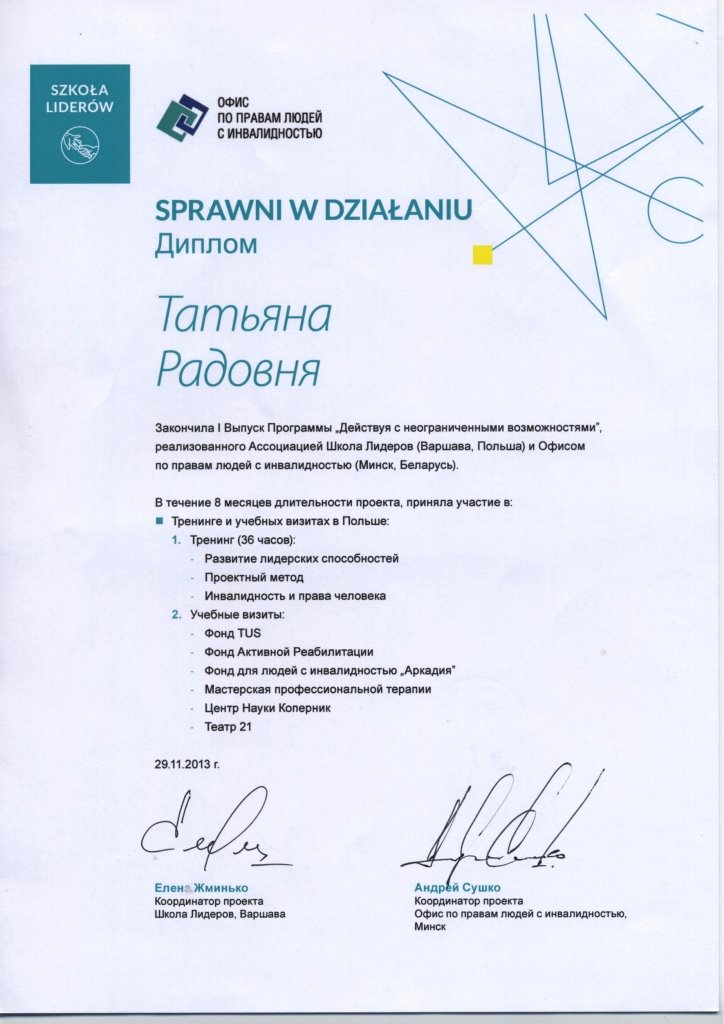 Радовня Татьяна Владимировна, методист отдела по воспитательной работе с молодежью, стала выпускницей I Программы «Действуя с неограниченными возможностями», реализованной Просветительским правозащитным учреждением «Офис по правам людей с инвалидностью» (Минск, Беларусь) и Ассоциацией «Школа Лидеров» (Варшава, Польша).