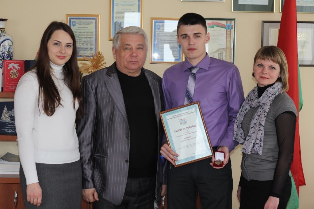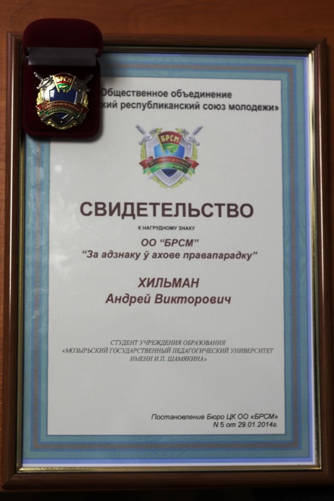 Хильман Андрей, командир Добровольной дружины «Молодежный отряд охраны правопорядка им. А.П. Царенко» ((студент 5 курса физико-математического факультета), награжден специальным нагрудным знаком ОО «БРСМ» «За отличие в охране правопорядка».