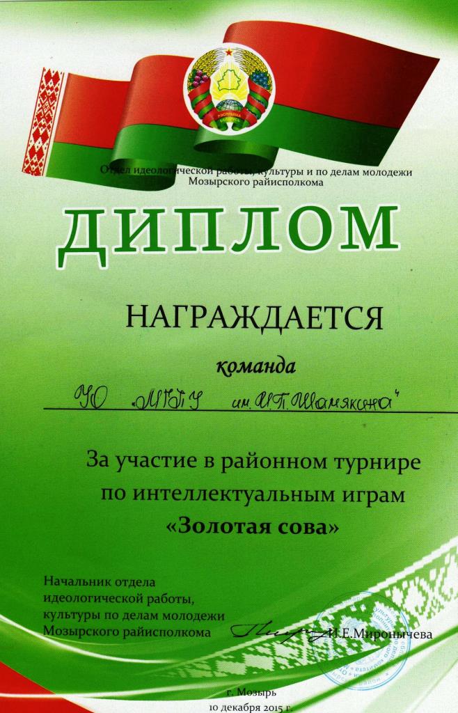 10 декабря 2015 года в РЦ «Спутник» состоялся районный турнир по интеллектуальным играм «Золотая сова» среди молодежи Мозырщины.