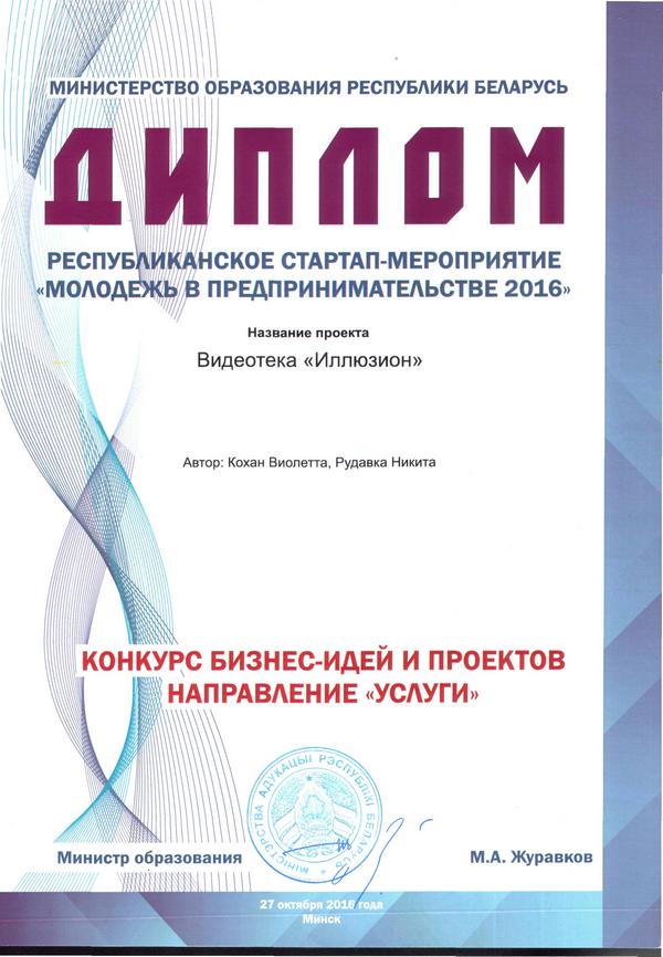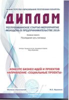 - Республиканский конкурс проектов и инициатив творческой молодежи «Гений-стартап» (диплом победителя).