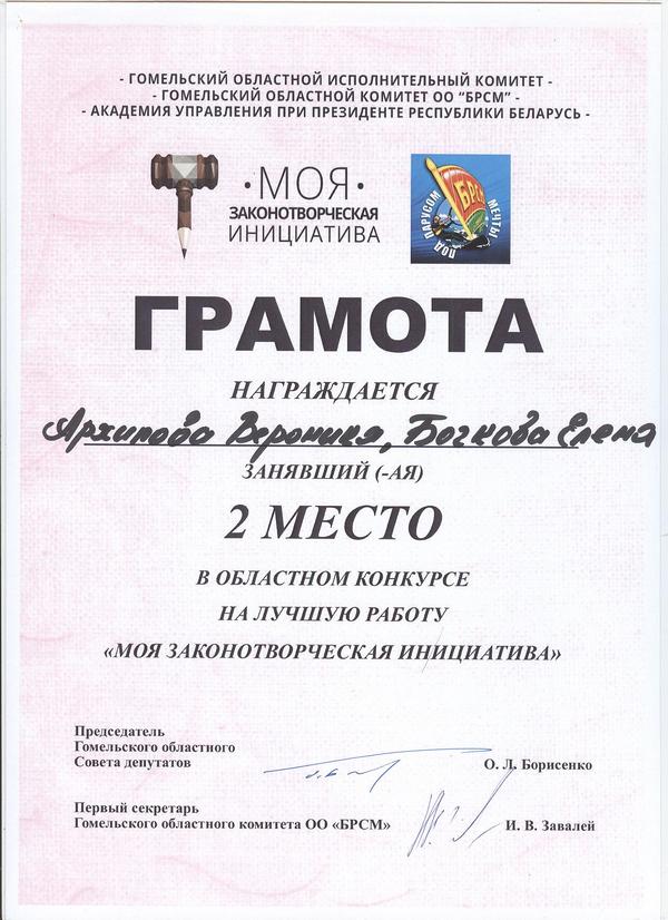 - Областной конкурс «Моя законотворческая инициатива» (грамота в номинации «За лучшую работу»);