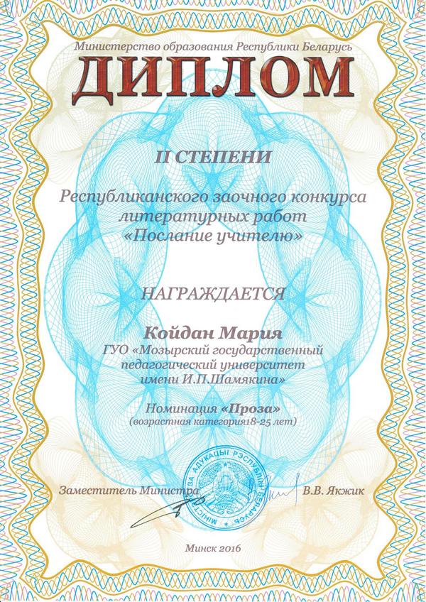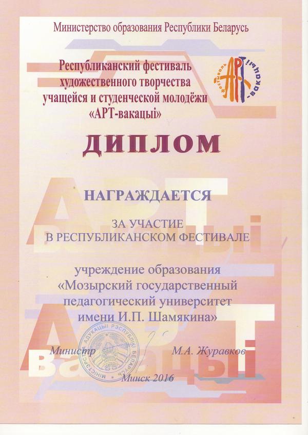 - Республиканский фестиваль художественного творчества учащейся и студенческой молодежи «АРТ-вакацыi» - 2016 (диплом за участие).