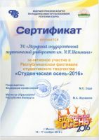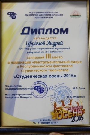 - Республиканский фестиваль студенческого творчества «Студенческая осень-2016 (диплом за участие). В ходе работы фестиваля участники получили возможность проявить свои творческие возможности и задать актуальные вопросы, волнующие студентов. Из 33 вузов, принявших участие в фестивале, студент физико-инженерного факультета Ефремов Андрей завоевал диплом 3 степени в номинации «Инструментальный жанр».