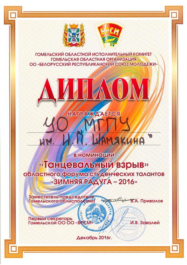 - Областной этап республиканского конкурса «Студент года - 2016» (студентка 3 курса факультета дошкольного и начального образования отмечена дипломом в номинации «Открытие года»).