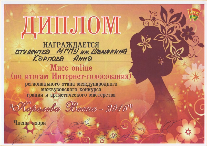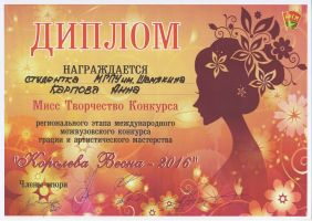 - Областной конкурс грации и артистического мастерства «Королева Весна-2016» (дипломы в номинации ONLINE», «Мисс Творчество»).