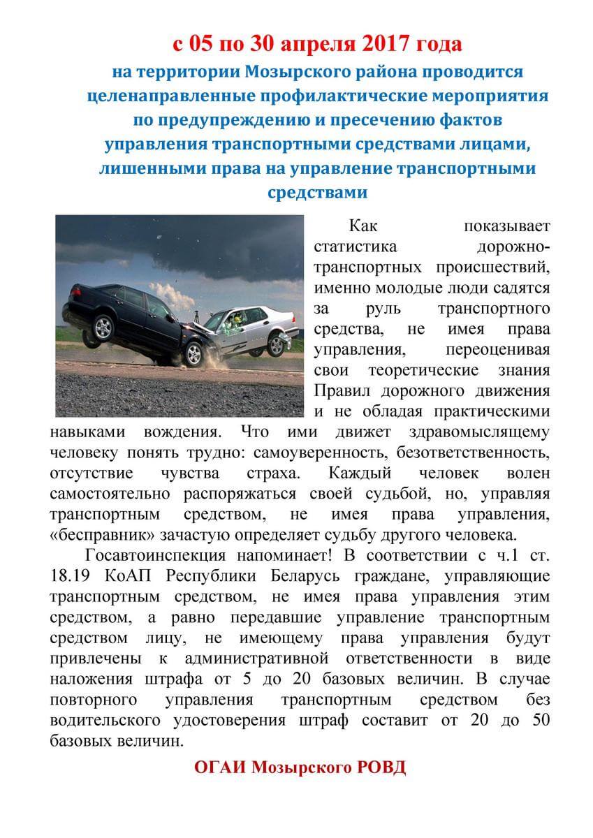 С 05 по 30 апреля 2017 года на территории Мозырского района проводится целенаправленные профилактические мероприятия по предупреждению и пресечению фактов управления транспортными средствами лицами, лишенными права на управление транспортными средствами