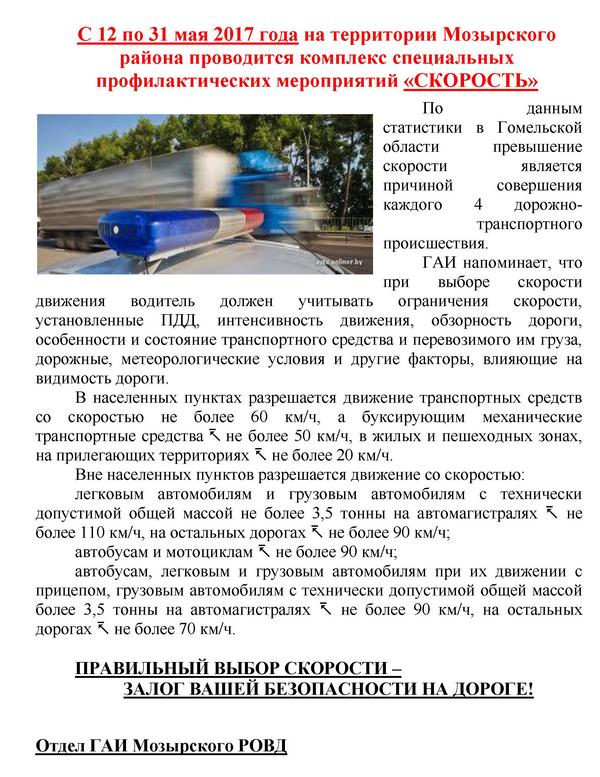 С 12 по 31 мая 2017 года на территории Мозырского района проводится комплекс специальных профилактических мероприятий «СКОРОСТЬ»