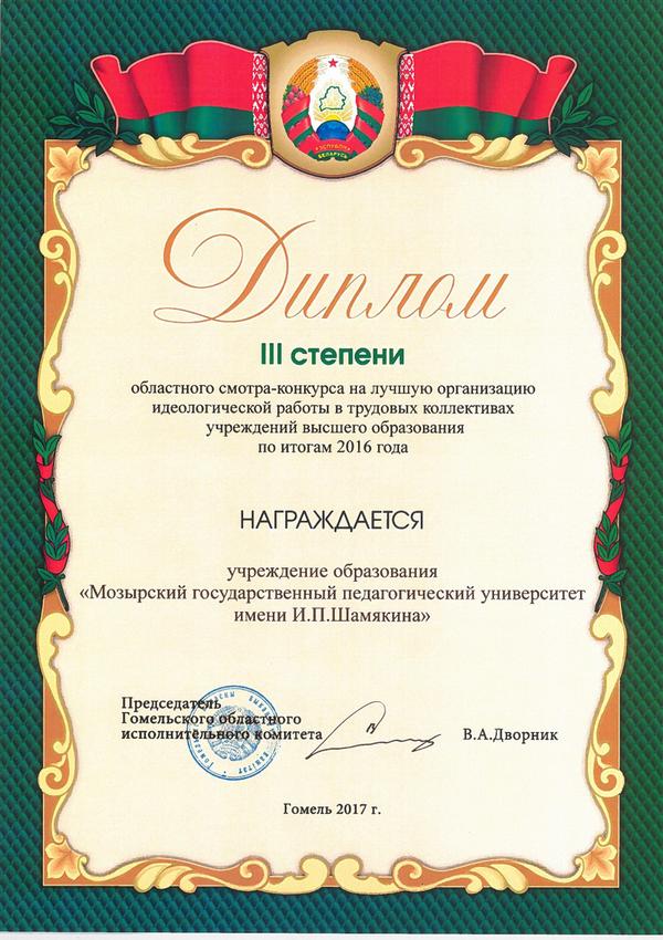 По итогам конкурса УО «Мозырский государственный педагогический университет имени И.П. Шамякина» среди учреждений образования Гомельской области был награжден дипломом III степени.