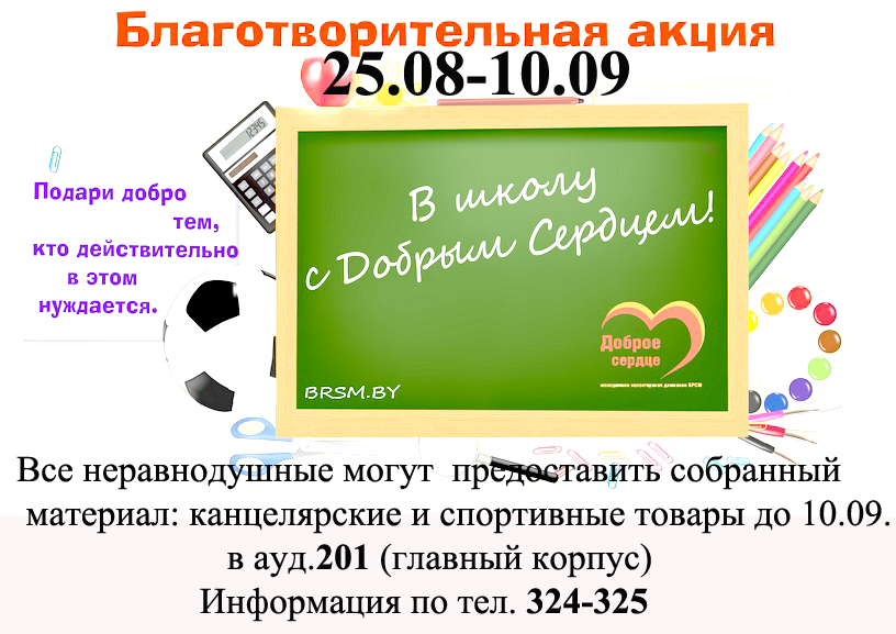 В преддверие празднования Дня знаний отдел по воспитательной работе с молодежью университета объявляет старт благотворительной акции «В школу с Добрым Сердцем!». В рамках акции организуется сбор канцелярских принадлежностей, других необходимых вещей для подготовки к предстоящему учебному году детям, оказавшимся в трудной жизненной ситуации.