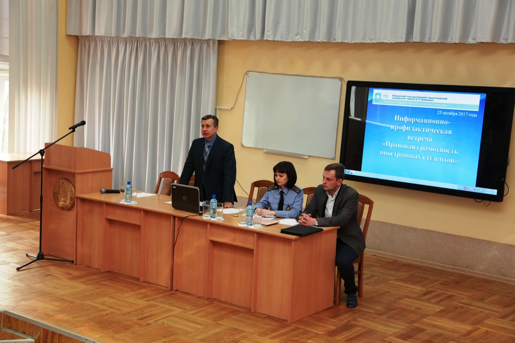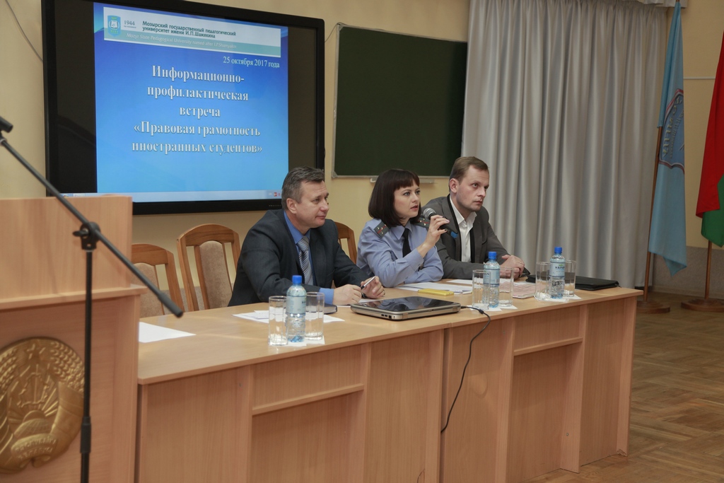 В рамках «Правовой недели», которая проводится с целью профилактики правонарушений, 25 октября на базе УО МГПУ им.И.П.Шамякина состоялась информационно-профилактическая встреча «Правовая грамотность иностранных студентов» с участием администрации университета, сотрудников отделения по гражданству и миграции Мозырского РОВД Гомельской области Лещук О.Г. и сотрудником Территориальных орган пограничной службы Мозырского пограничного отряда Мироновым А. С.