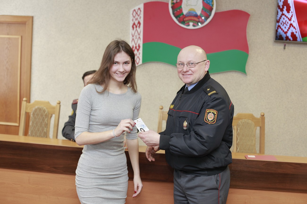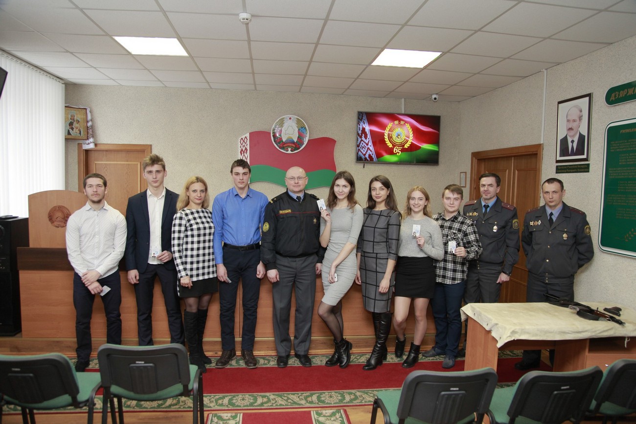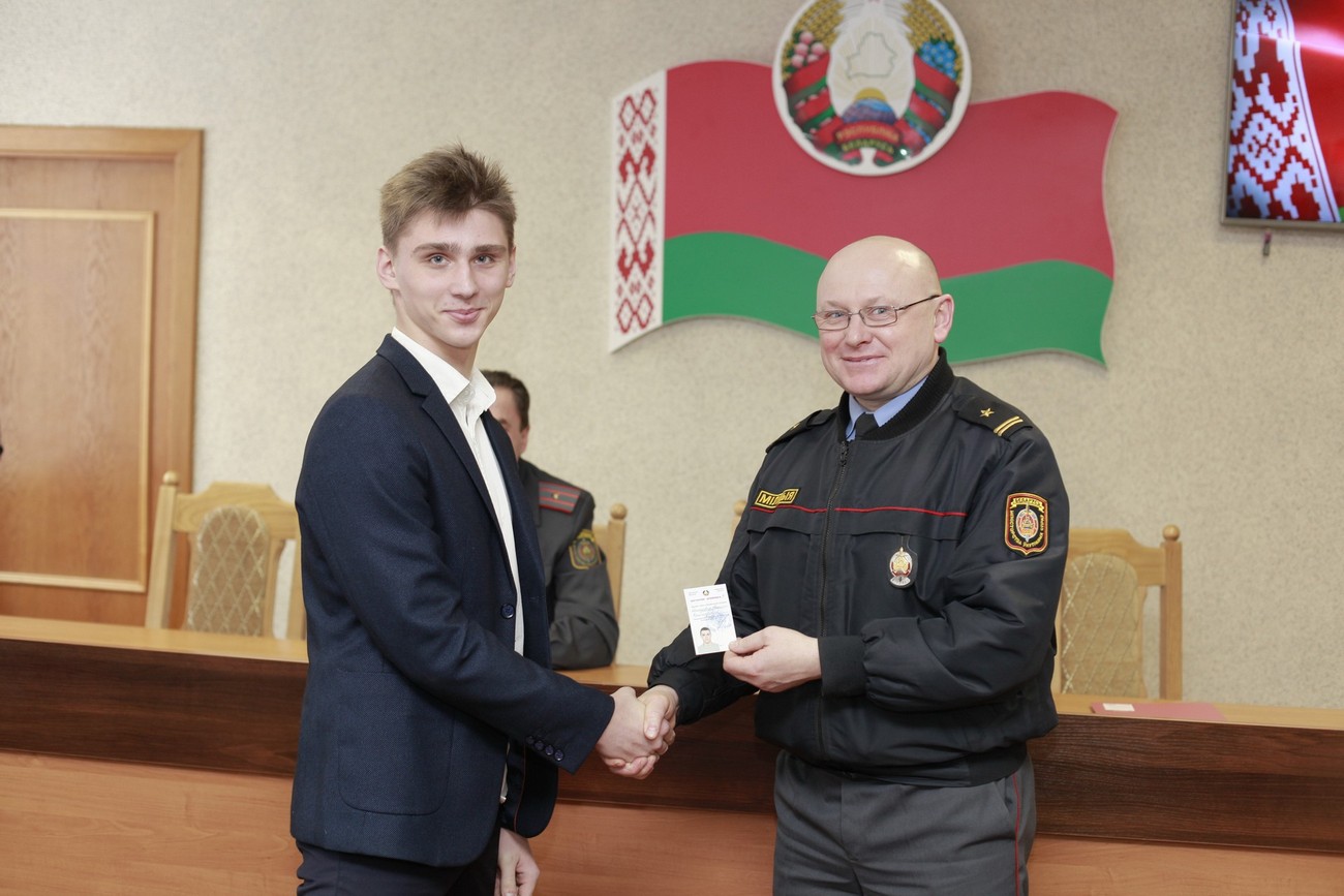 Заместитель начальника по идеологической работе, кадровому обеспечению, майор милиции Никитенко Алексей Николаевич вручил удостоверения семи активистам. Данные удостоверения вручаются за активное участие в охране правопорядка, профилактике правонарушений среди несовершеннолетних и молодежи, реализации патриотических акций и проектов ОО «БРСМ».