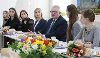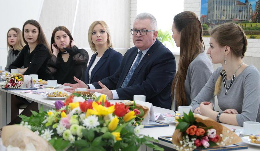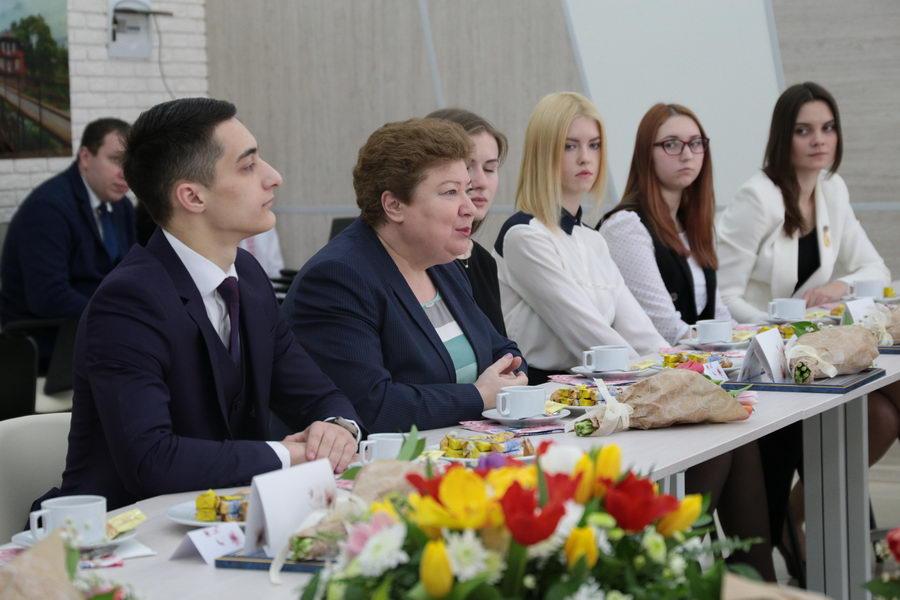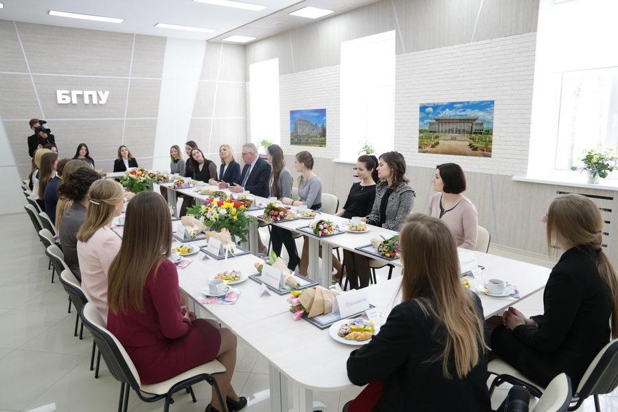 Встреча Карпенко И.В. с лучшими студентками высших учебных учреждений страны, достигшими высоких результатов в научной, общественной, спортивной и культурной жизни, проходила за круглым столом в конференц-зале университета БГПУ им. Максима Танка. Деловая встреча перешла в беседу за чашкой чая, где в приятной дружеской атмосфере за чаепитием обсуждались не только серьезные вопросы, касающиеся образования, но и повседневные вопросы жизни и досуга женщин, их роль в семье и государстве. Было интересно услышать мнение Министра о женщинах, занимающих высокие должности в системе управления, а также о качествах, которыми должна обладать любая женщина.