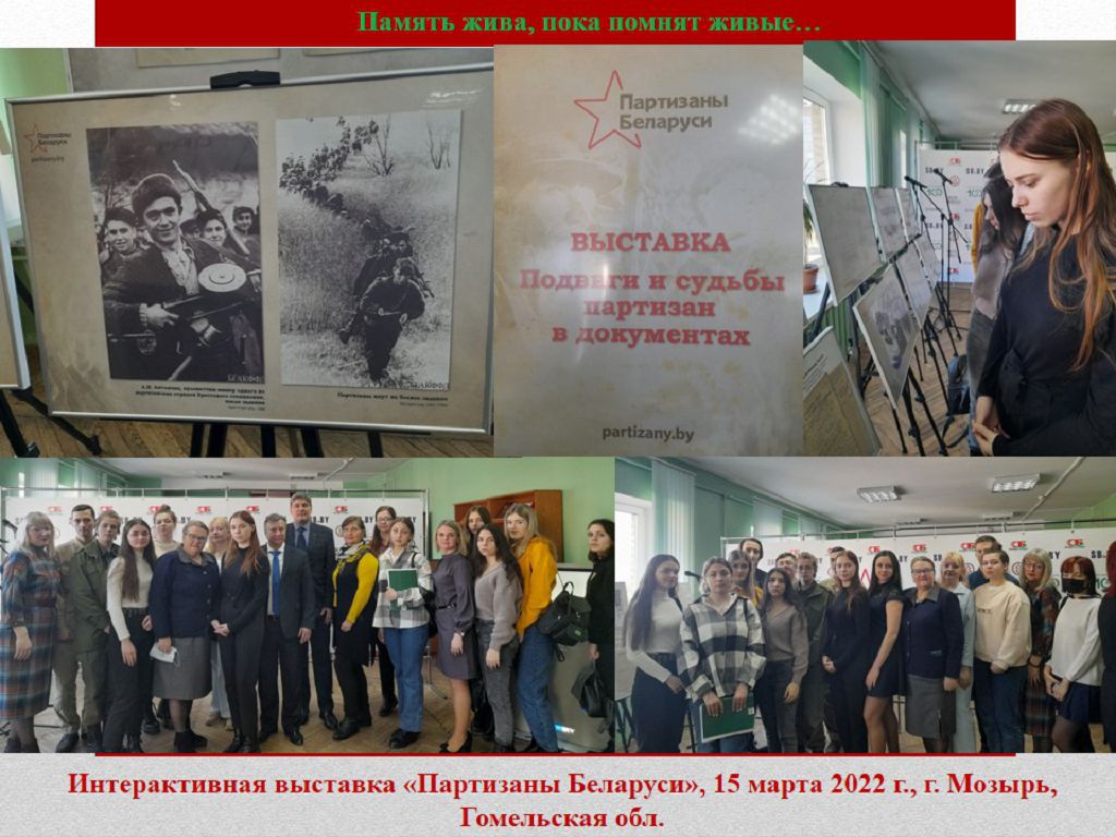 15 марта 2022 года студенты филологического факультета посетили выставку «Подвиги и судьбы партизан в документах». Материалы выставки подготовлены в рамках разработки спецпроекта «Партизаны Беларуси» Издательским домом «Беларусь сегодня» и Национальным архивом Беларуси. Целью проекта является увековечить память белорусских партизан, сражавшихся в годы Великой Отечественной войны против германских оккупантов и распространения нацизма, а представленные на выставке материалы способствуют патриотическому воспитанию молодежи, повышению их гражданско-патриотического сознания и активизации поисковой работы среди специалистов-историков, а также всех любителей отечественной истории.