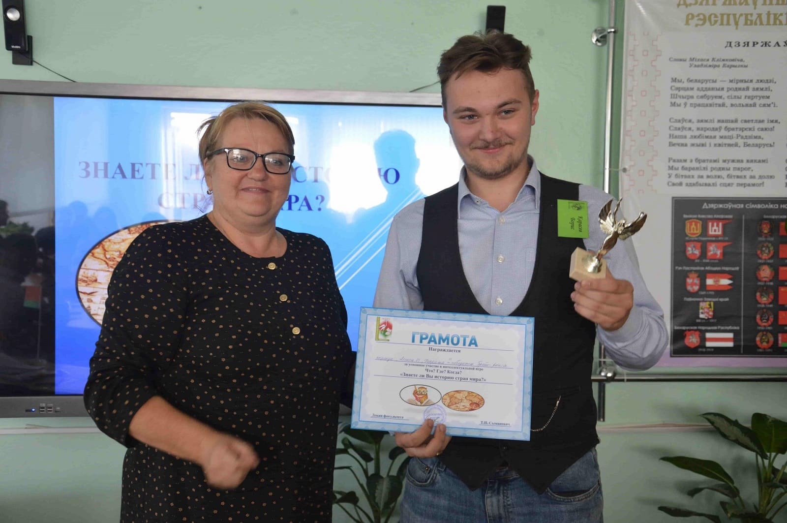 Удовольствие от интеллектуального состязания получили как сами участники, так и члены жюри, и организаторы – преподаватели кафедры истории и обществоведческих дисциплин. Несмотря на накал страстей, все участники от души повеселились, узнали много нового и интересного. В итоге победили опыт и знания! С незначительным отрывом студенты 2 курса: Карасев Борис (капитан команды «Legio VI Ferrat»), Ткачук Антон, Сизенок Даниил, Хомченко Виктория, Бойковский Сергей, Сирож Андрей одержали неоспоримую победу над первокурсниками. Однако в процессе игры участники команды знатоков 1 курса «Primo Victoria»: Жук Илья (капитан команды), Шоба Егор, Жуковская Алеся, Пучков Егор, Браим Дарья, Лебедева Марина показали хорошую эрудицию и смекалку. Лучшими знатоками были признаны Жук Илья, Жуковская Алеся, Карасев Борис, Сизенок Даниил. Во время музыкальной паузы знатоков команд и зрителей интеллектуальной игры порадовала своим прекрасным вокалом студентка 1 курса специальности «История и обществоведческие дисциплины» Александра Яковлева. Всем знатокам команд спасибо за инициативу и активное участие!