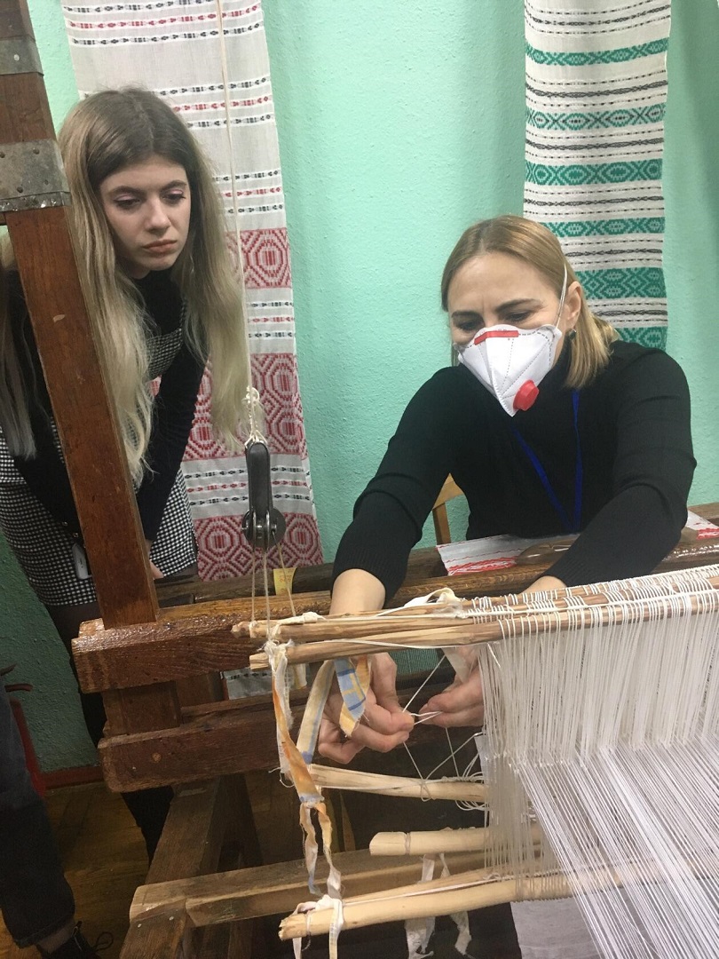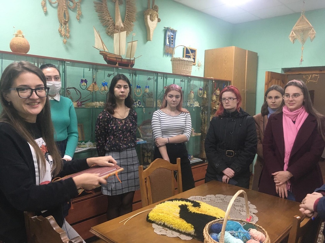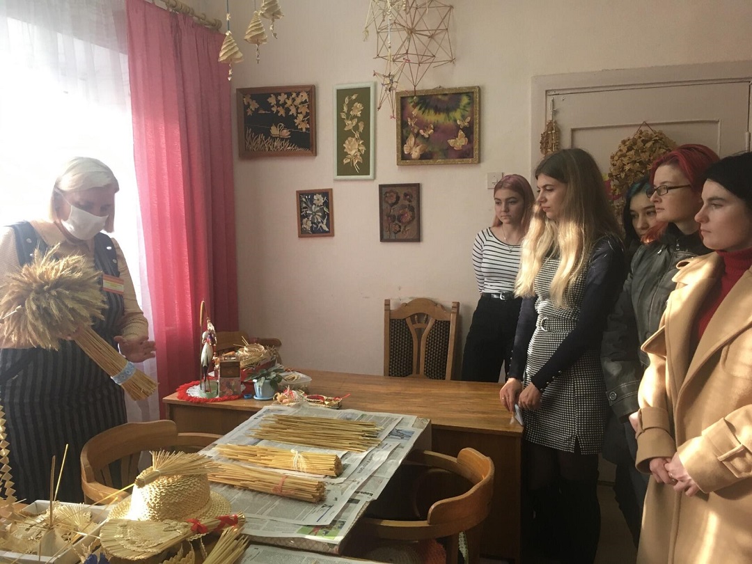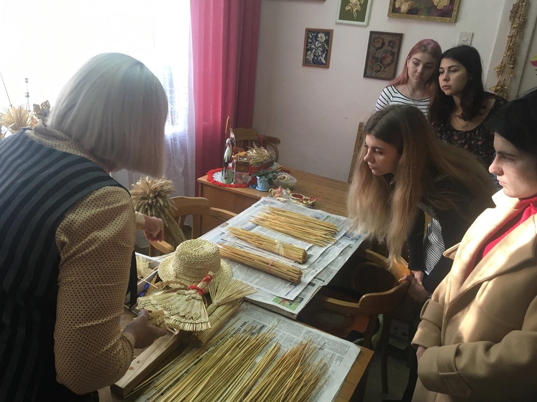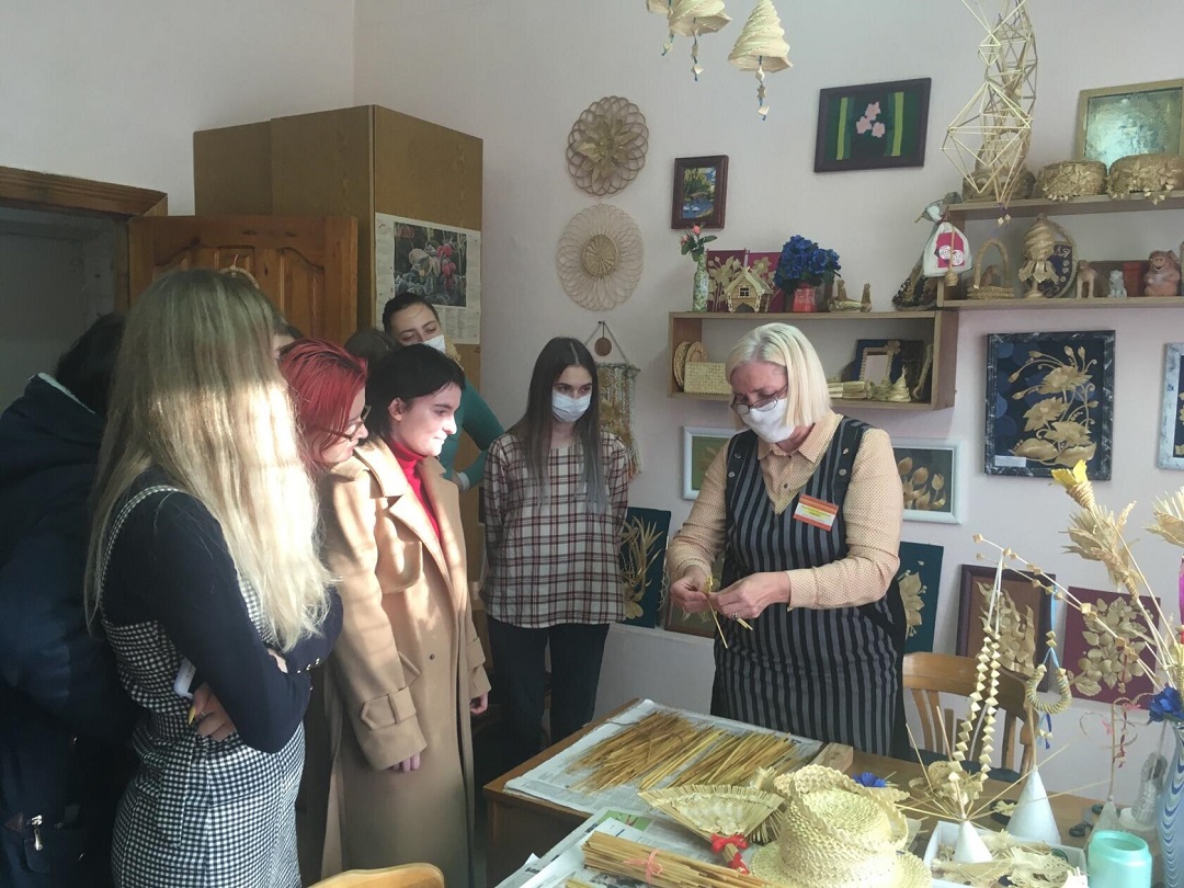 Вторая экскурсия состоялась в Мозырском центре национальных культур и ремесел. Директор этого уникального учреждения, Наталья Адамовна Хорошкевич, ознакомила нас с историей центра и основными видами деятельности мастеров центра ремесел. Наши студенты с большим интересом познакомились с экспозицией декоративных изделий, выполненных в традиционных техниках белорусского декоративно-прикладного творчества. Особое внимание студентов привлекли проведенные сотрудниками центра мастер-классы по ткачеству на старинном ткацком станке, соломоплетению и изготовлению гобеленов, в ходе которых мастера с радостью делились с нами своими секретами в области заготовки, подготовки сырья и материалов, а также технологии изготовления изделий. Подобные встречи с творческими людьми, профессионалами своего дела, которые не только сохраняют, но развивают традиционные ремесла своего региона, способствуют приобщению молодежи к традиционной народной культуре, прививают любовь к ремесленным традициям Полесского края.
