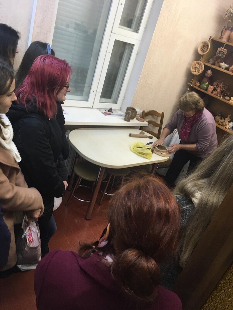 Первая экскурсия была проведена в музее-мастерской известного художника-керамиста, заслуженного деятеля искусств БССР Николая Пушкаря. Экскурсовод Екатерина Медведева познакомила нас с удивительной биографией Николая Никитича и его творчеством. Мы с удовольствие любовались его произведениями. Несмотря на нелегкую, полную трагических событий жизнь, Николай Никитич Пушкарь сумел сохранить чувство юмора, умение радоваться каждому дню. В основном скульптор лепил фигурки простых полешуков, тонко передавал их мимику, настроение, характер. Работы Н.Н. Пушкаря – это уникальный мир народных образов с живыми чертами и добрым юмором, которые переносят нас в сердце полесского быта. Многие произведения Н.Пушкаря находятся в разных музеях Беларуси, за рубежом.В ходе экскурсии нам была предоставлена возможность поучаствовать в мастер-классе по изготовлению сувениров, приобщиться к тонкому искусству работы с глиной. Посещение музея-мастерской стало познавательным, ярким, эмоциональным событием для каждого из нас, позволило прикоснуться к таинству самобытной культуры белорусского Полесья, ощутить свою принадлежность к удивительной и уникальной полесской культуре.