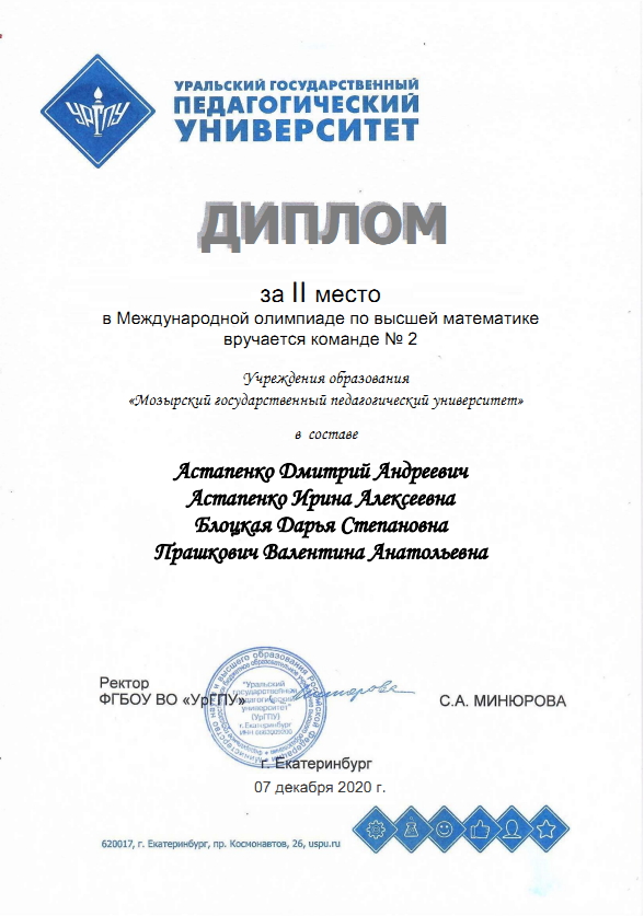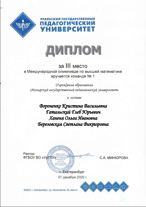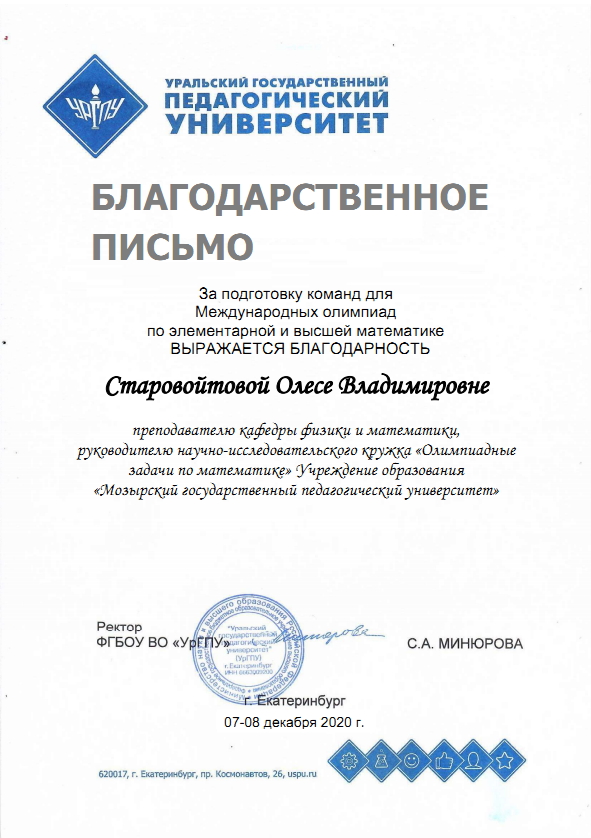 За подготовку команд для Международных олимпиад по элементарной и высшей математике С.А. Минюрова, ректор ФГБОУ ВО «Уральский государственный педагогический университет», выразила благодарность Старовойтовой Олесе Владимировне, преподавателю кафедры физики и математики, руководителю научно-исследовательского кружка «Олимпиадные задачи по математике» учреждения образования «Мозырский государственный педагогический университет».