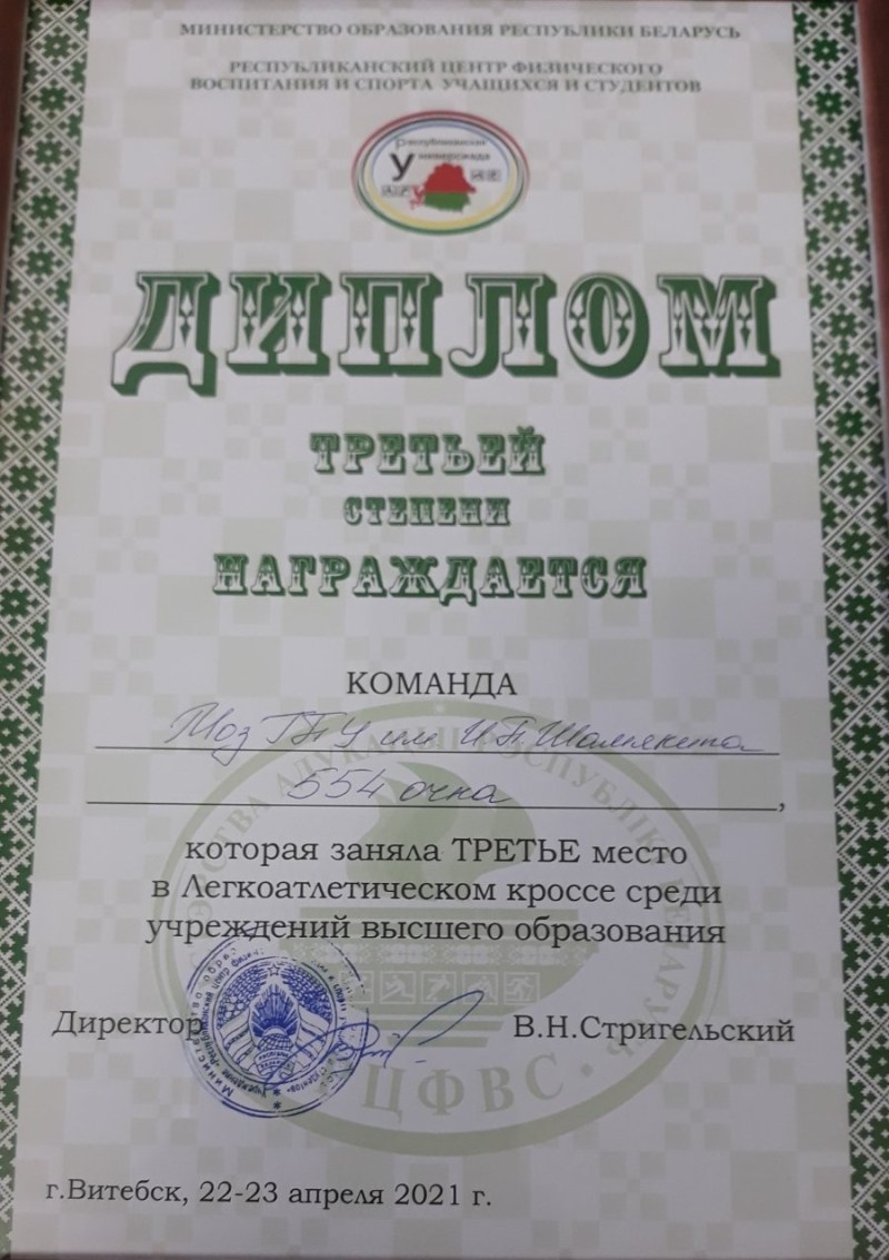 С 22.04.2021 – 23.04.2021 в г. Витебске состоялась Республиканская универсиада-2021 по легкоатлетическому кроссу. Сборная команда УО МГПУ им.И.П.Шамякина по легкоатлетическому кроссу заняла III-е место. В соревнованиях приняло участие 22 команды учреждений высшего образования.