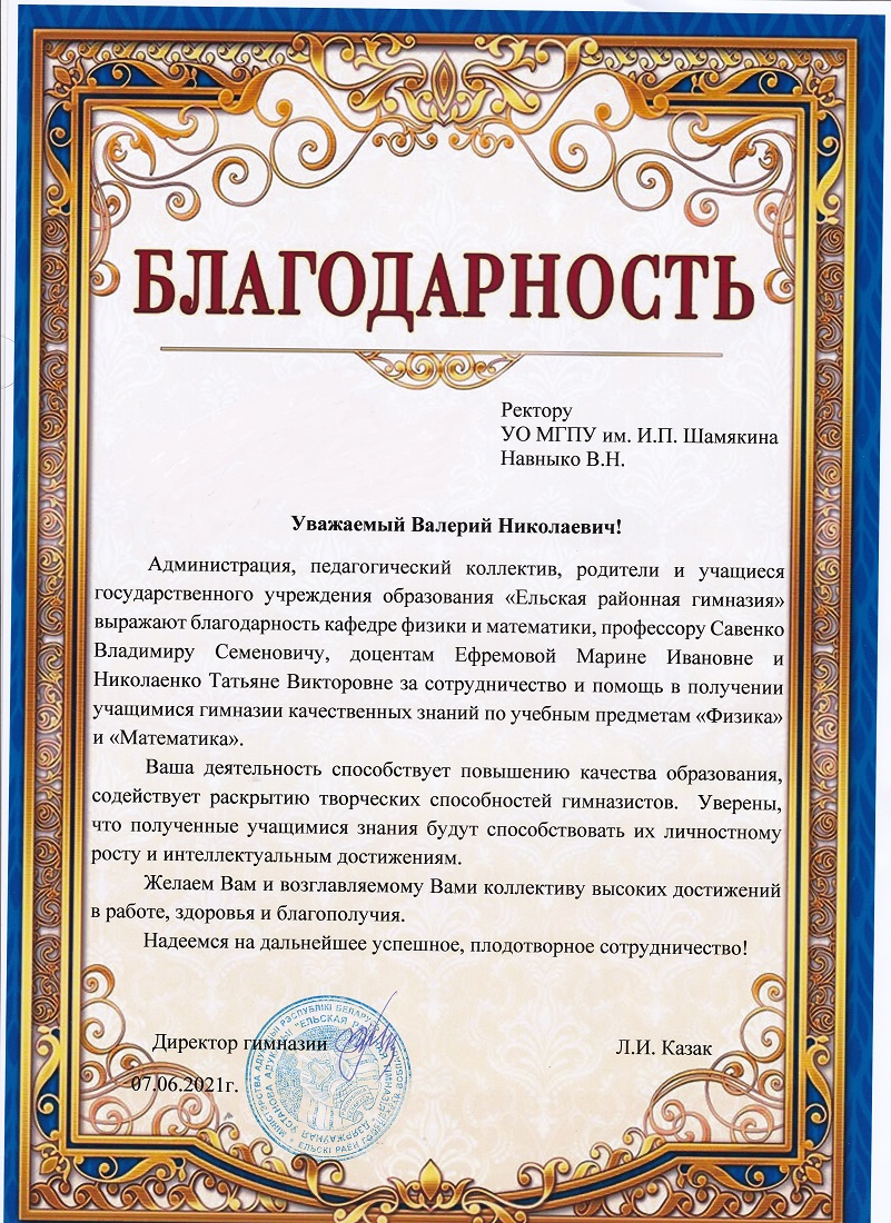Благодарность Ректору УО МГПУ им. И.П. Шамякина Навныко В. Н.
