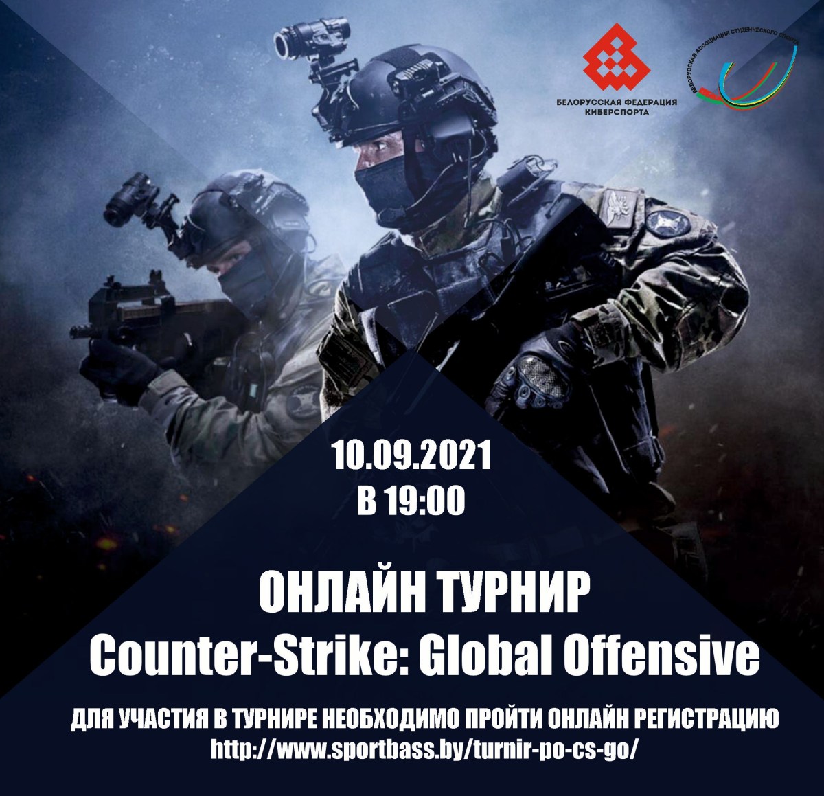 Белорусская ассоциация студенческого спорта совместно с РОО "Белорусская федерация киберспорта" проводит онлайн спортивно-массовое мероприятие по киберспортивной дисциплине CS:GO (далее-турнир) 10-11 сентября 2021 года.