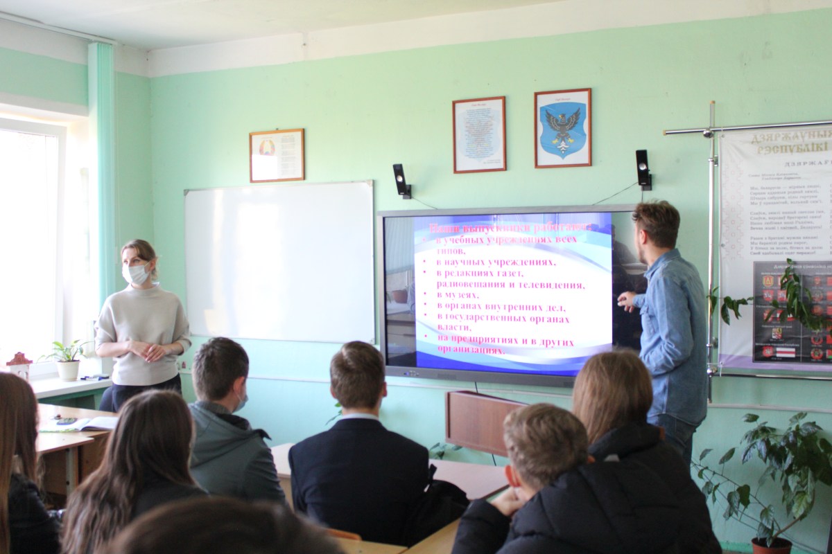 На базе Центра Русистики состоялась презентация специальности «Русский язык и литература. Иностранный язык (английский)». Гости филологического факультета ознакомились с редкими изданиями книжного фонда и образовательными мультимедийными проектами Центра. Заведующий кафедрой белорусской и русской филологии Т.Н. Чечко отметила конкурентоспособность специальности на рынке образовательных услуг, ее соответствие потребностям современной молодежи. Студенты 2 курса 1 группы Срельцова О., Швец Ю, Чаусов П., Михальческо П. в формате стендапа представили свои достижения и приоритеты специальности «Русский язык и литература. Иностранный язык (английский)»:опыт межкультурной коммуникации, возможность участия в научных конференциях и литературно-творческих проектах.