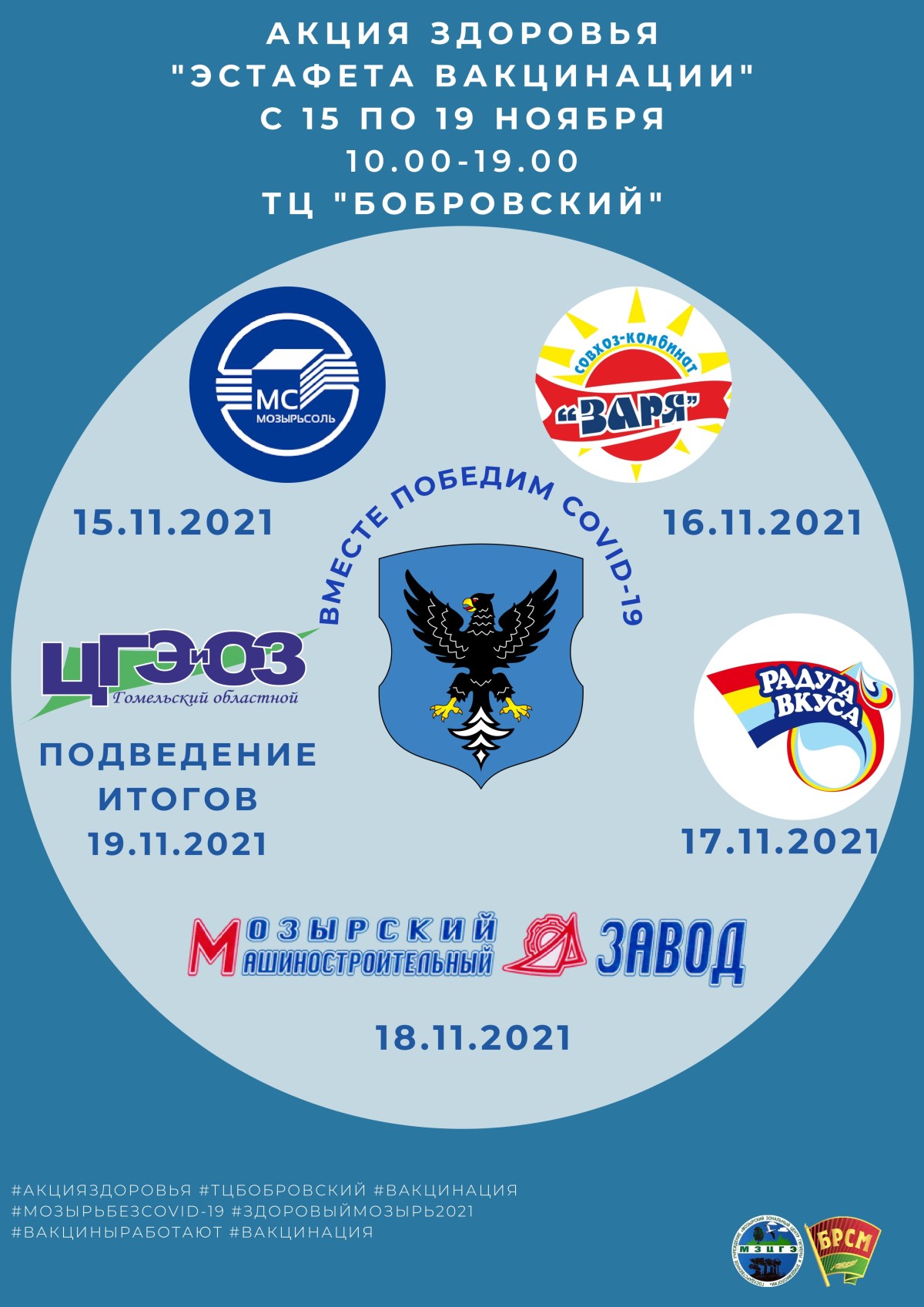 15 ноября в Мозырском районе в ТЦ «Бобровский» стартует Акция здоровья «Эстафета вакцинации» с участием ведущих предприятий района, которые приглашают Вас посетить прививочные пункты и защитить себя и своих близких от коронавирусной инфекции.