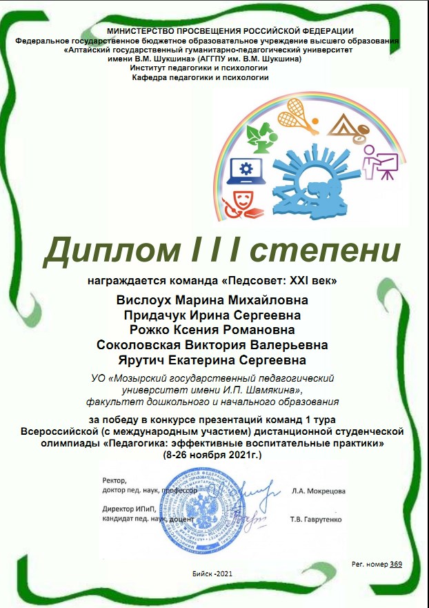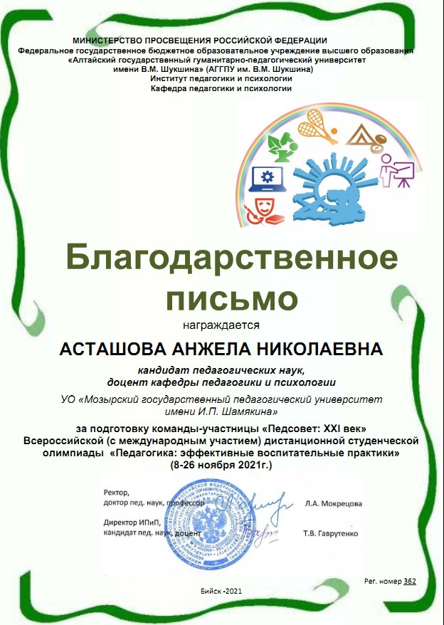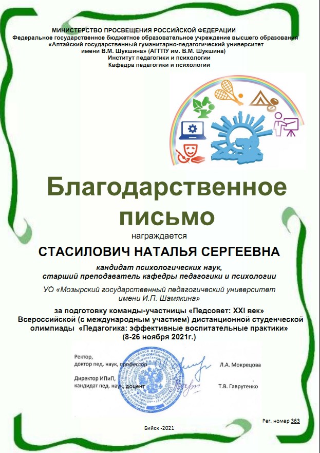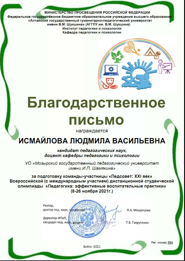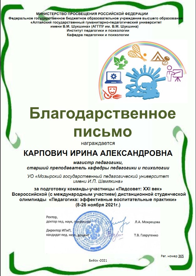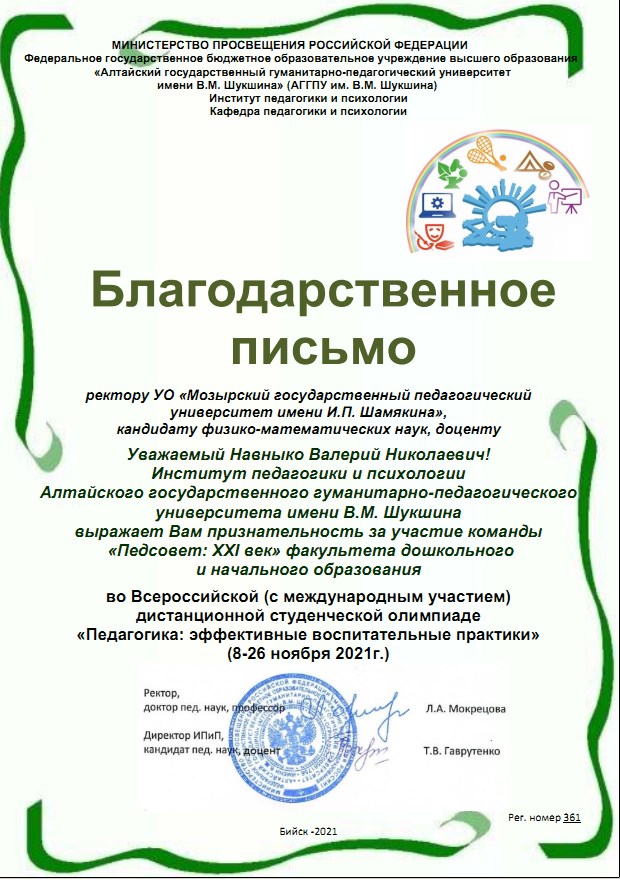 Благодарственное письмо со словами признательности за участие команды «Педсовет: XXI век» факультета дошкольного и начального образования во Всероссийской педагогической олимпиаде направлено ректору УО МГПУ имени И.П. Шамякина, Навныко В.Н., кандидату физико-математических наук, доценту.
