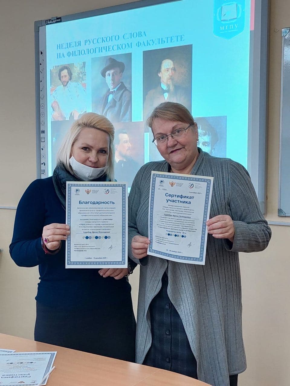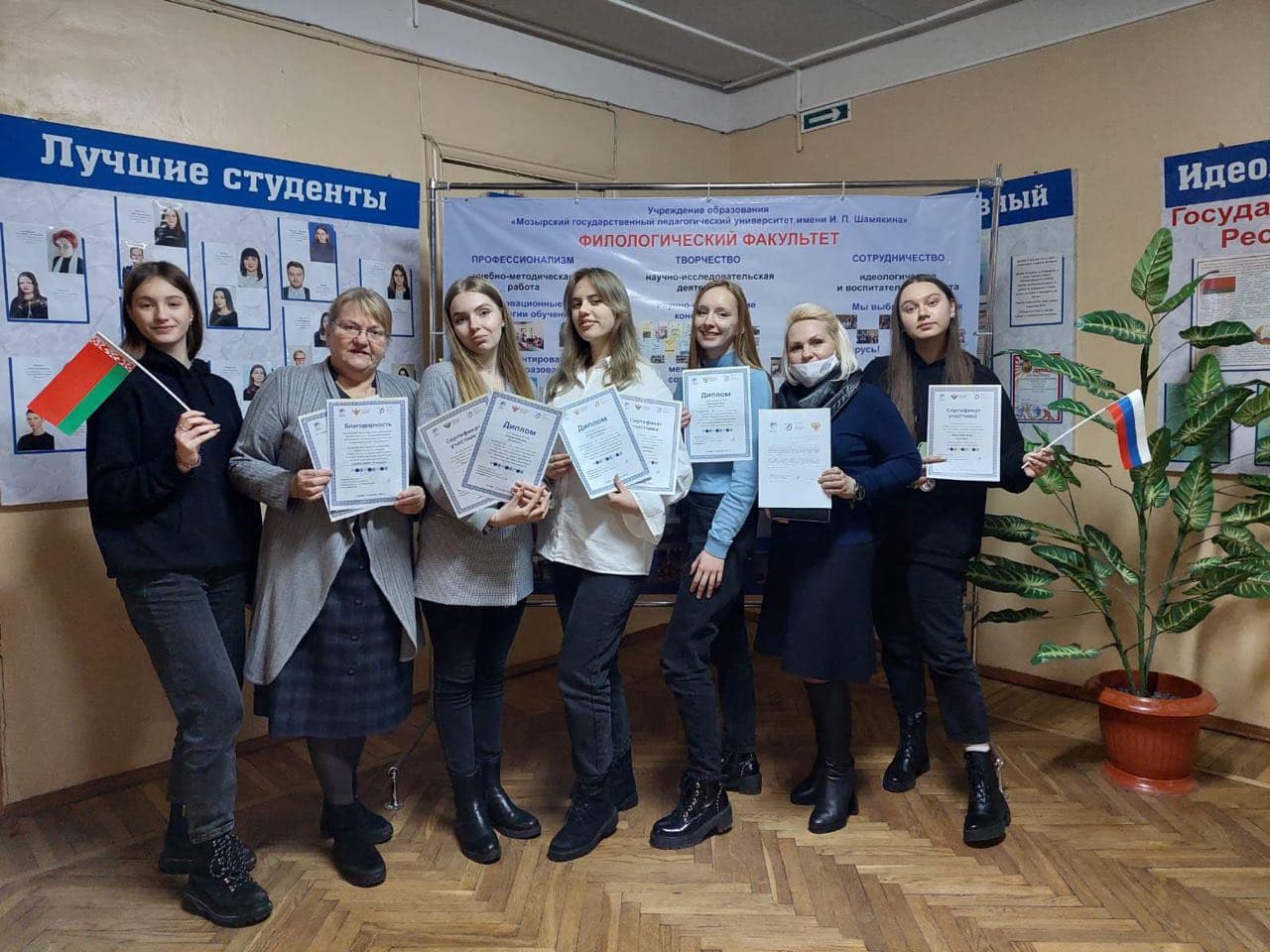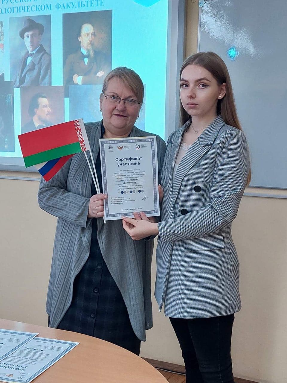 Наши студенты в финальном туре олимпиады заняли три призовых места. Дипломами победителей были отмечены: Пинчук Анастасия – 1-ое место; Позняк Владислава – 2-ое место; Стрельцова Ольга – 3-е место. В адрес руководства университета, декана факультета Сыманович Т.Н., зав. кафедрой белорусской и русской филологии Чечко Т.Н., старшего преподавателя Судибор И.Л. поступила благодарность за содействие в реализации Международного проекта «Образ ученого в прозе и драматургии М.А. Булгакова: эволюция, социальные аспекты и культурный резонанс». Сертификаты о прохождении курсов повышения квалификации по программе «Наука и искусство в преподавании русского языка и литературы» получили Чечко Т.Н., Судибор И.Л.