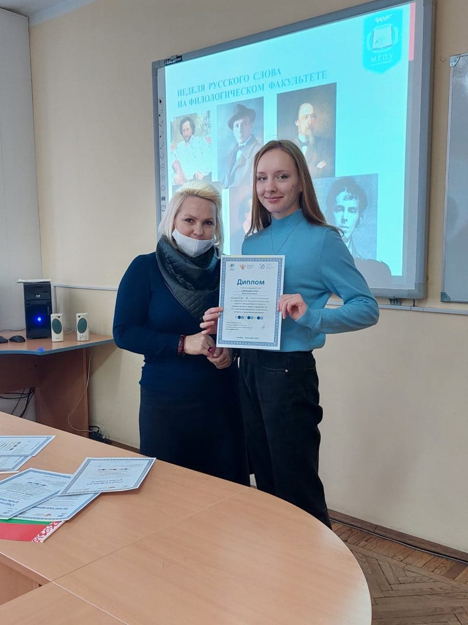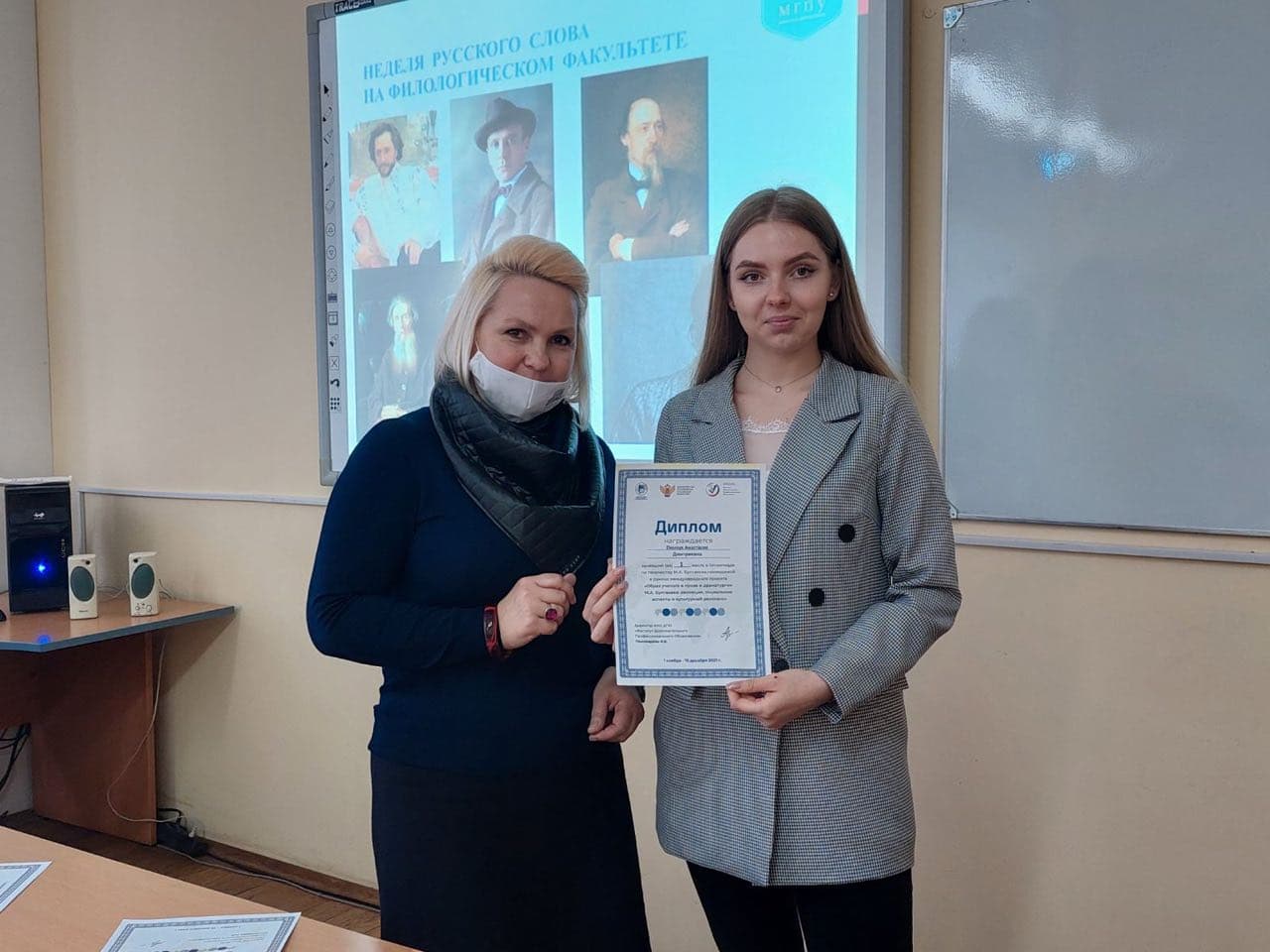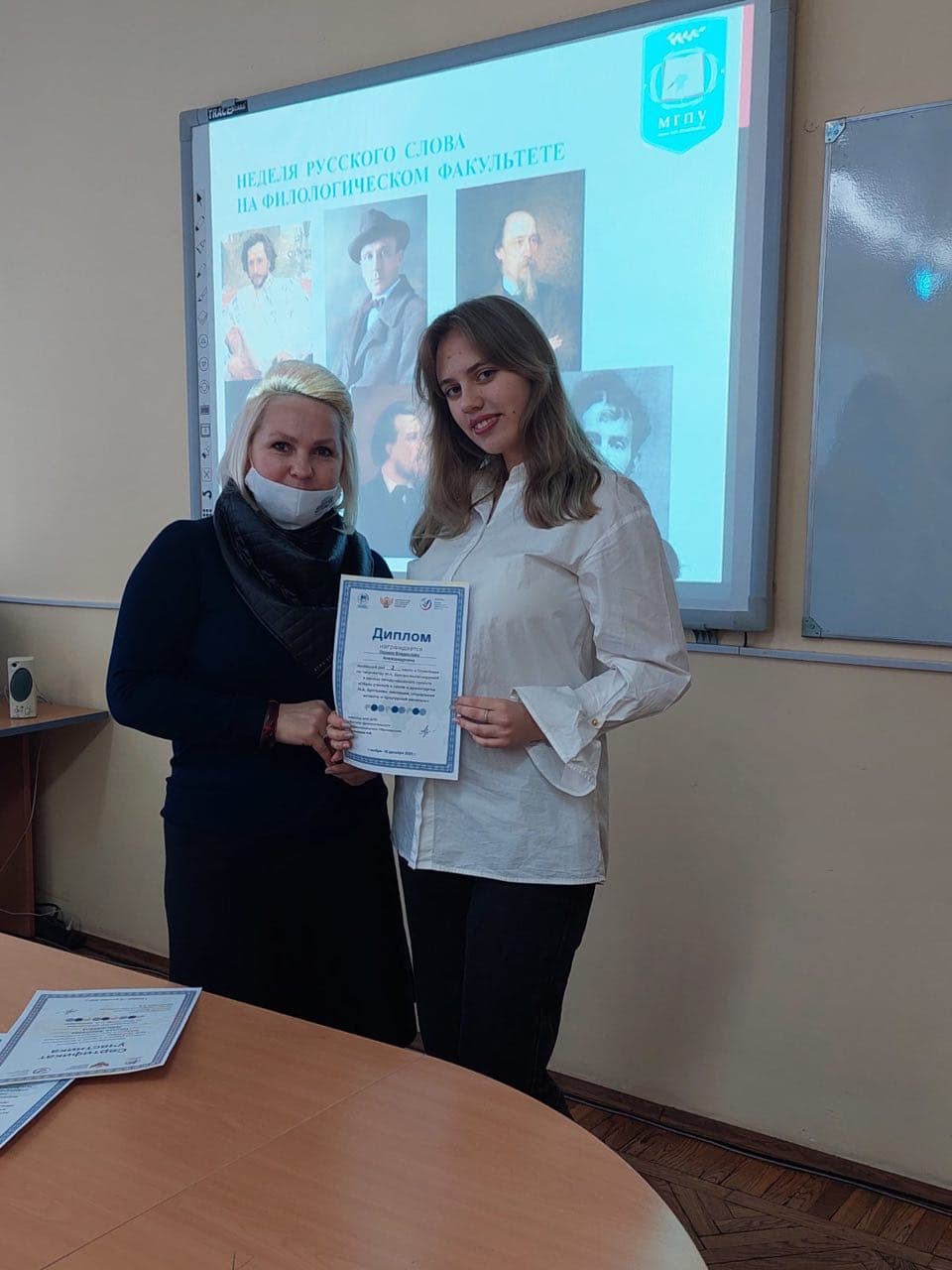 Наши студенты в финальном туре олимпиады заняли три призовых места. Дипломами победителей были отмечены: Пинчук Анастасия – 1-ое место; Позняк Владислава – 2-ое место; Стрельцова Ольга – 3-е место. В адрес руководства университета, декана факультета Сыманович Т.Н., зав. кафедрой белорусской и русской филологии Чечко Т.Н., старшего преподавателя Судибор И.Л. поступила благодарность за содействие в реализации Международного проекта «Образ ученого в прозе и драматургии М.А. Булгакова: эволюция, социальные аспекты и культурный резонанс». Сертификаты о прохождении курсов повышения квалификации по программе «Наука и искусство в преподавании русского языка и литературы» получили Чечко Т.Н., Судибор И.Л.